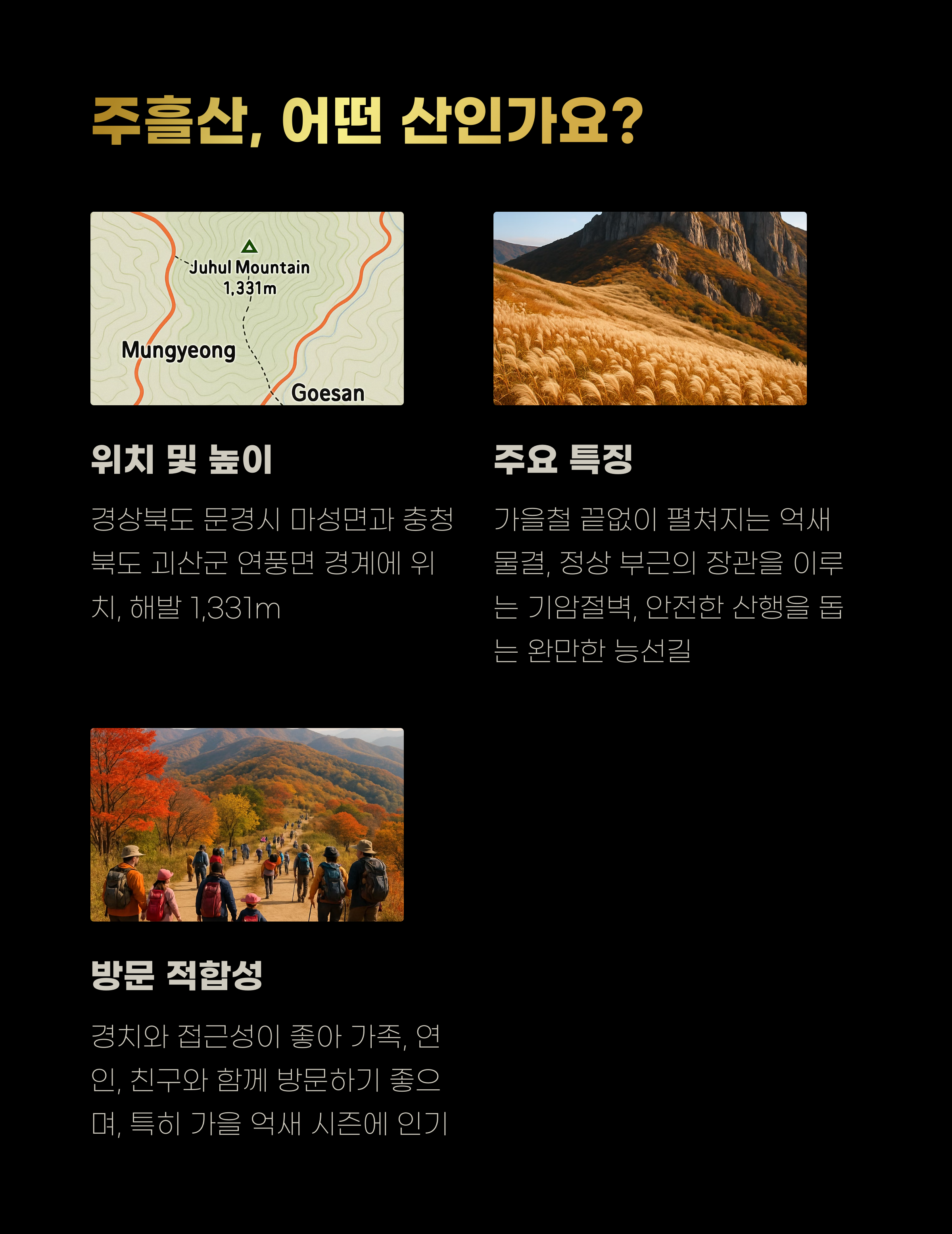 특히 억새가 흐드러지는 가을에는 주흘산 등산코스를 따라 펼쳐진 은빛 물결을 감상할 수 있어 매년 많은 사진가와 등산객이 방문합니다.