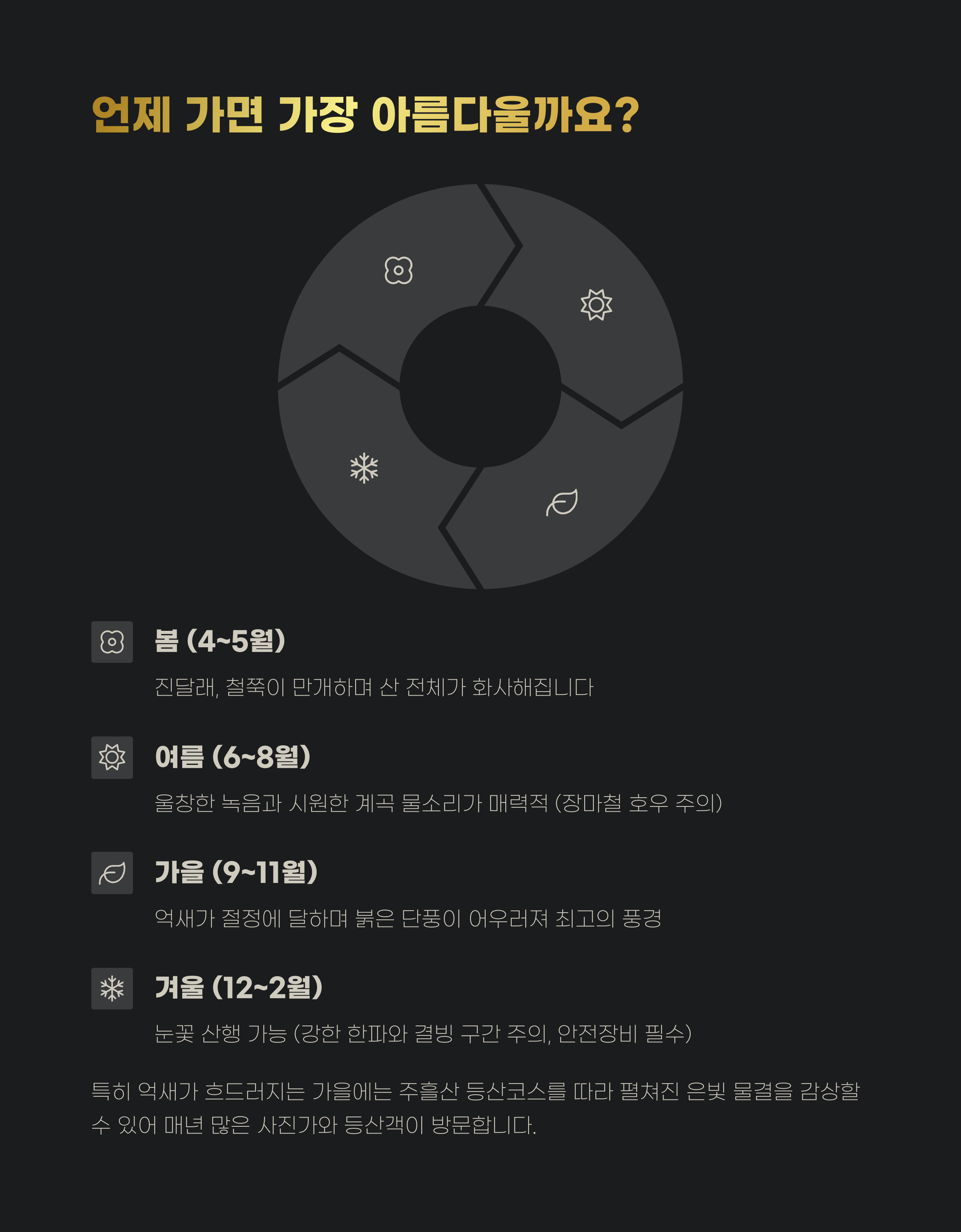- 여름(6~8월): 울창한 녹음과 시원한 계곡 물소리가 매력적이나, 장마철 호우 주의.