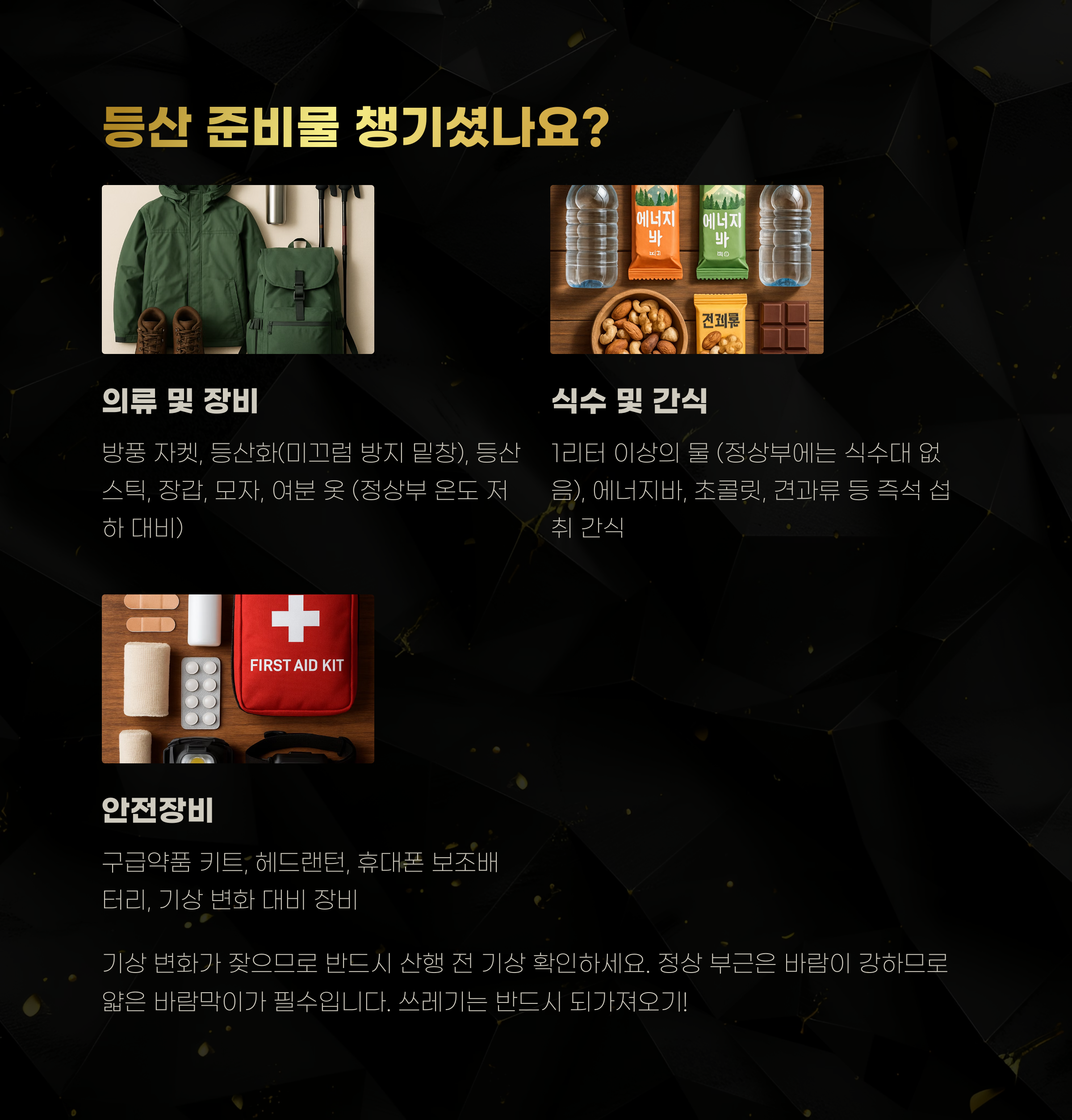 - 휴대폰 보조배터리 (야간 하산 대비)