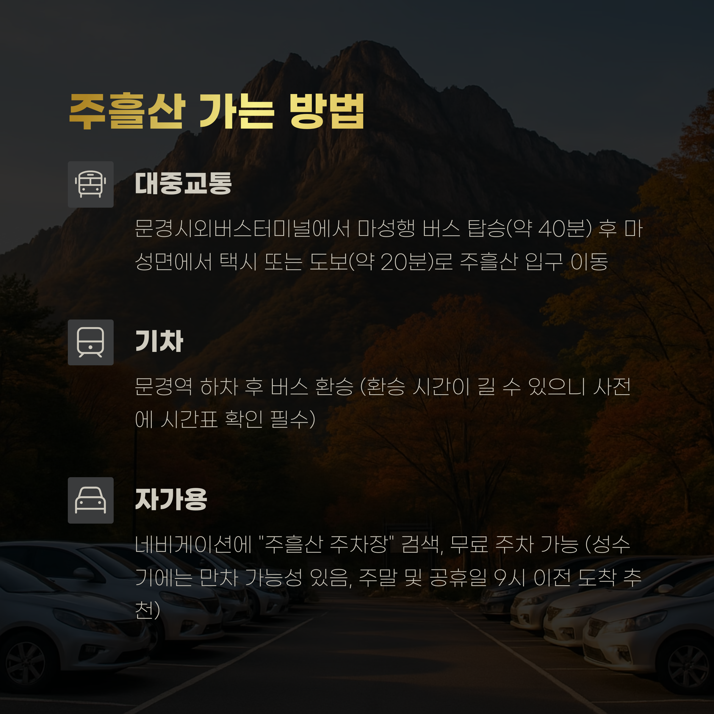 - 마성면에서 택시 또는 도보(약 20분)로 주흘산 입구 이동