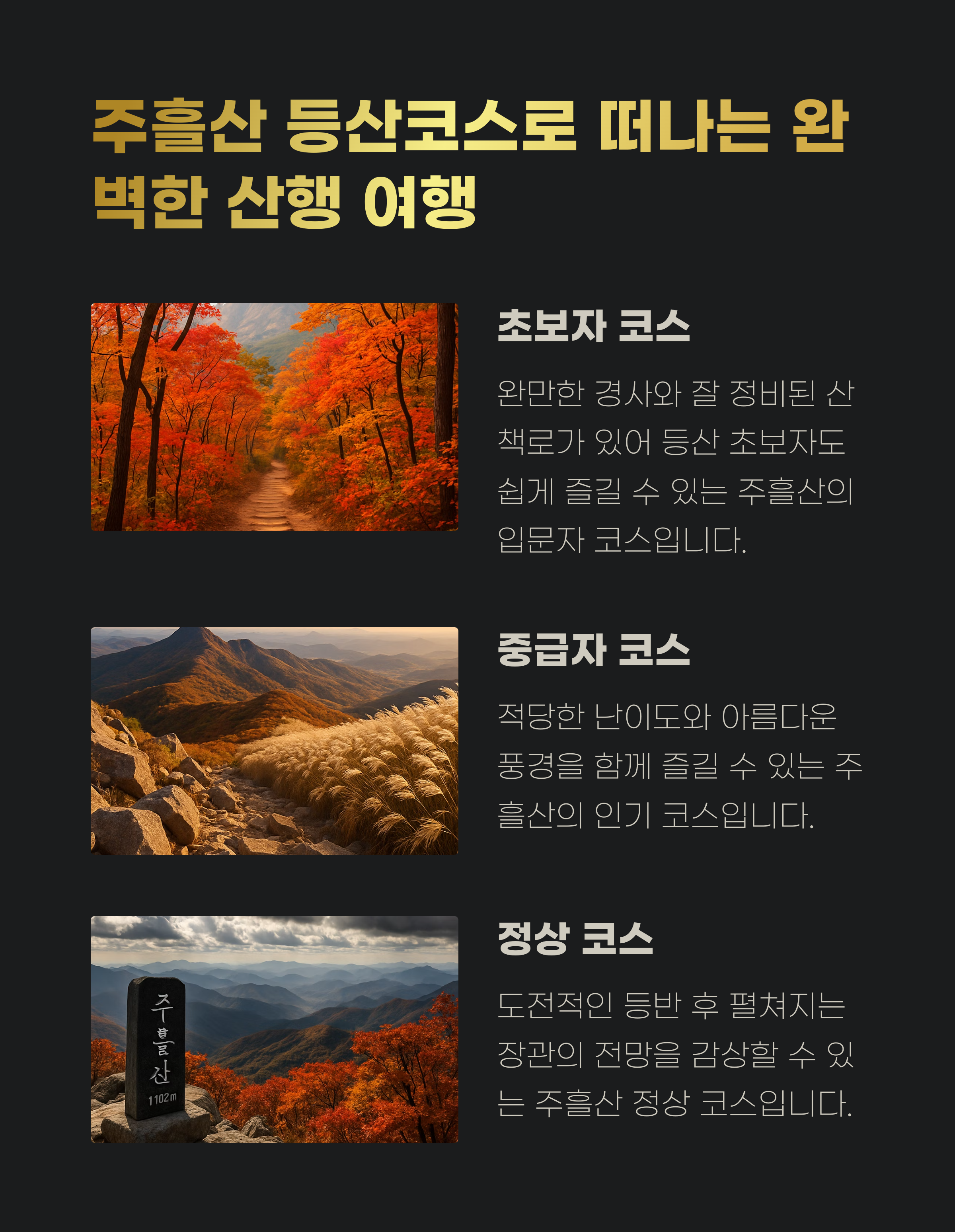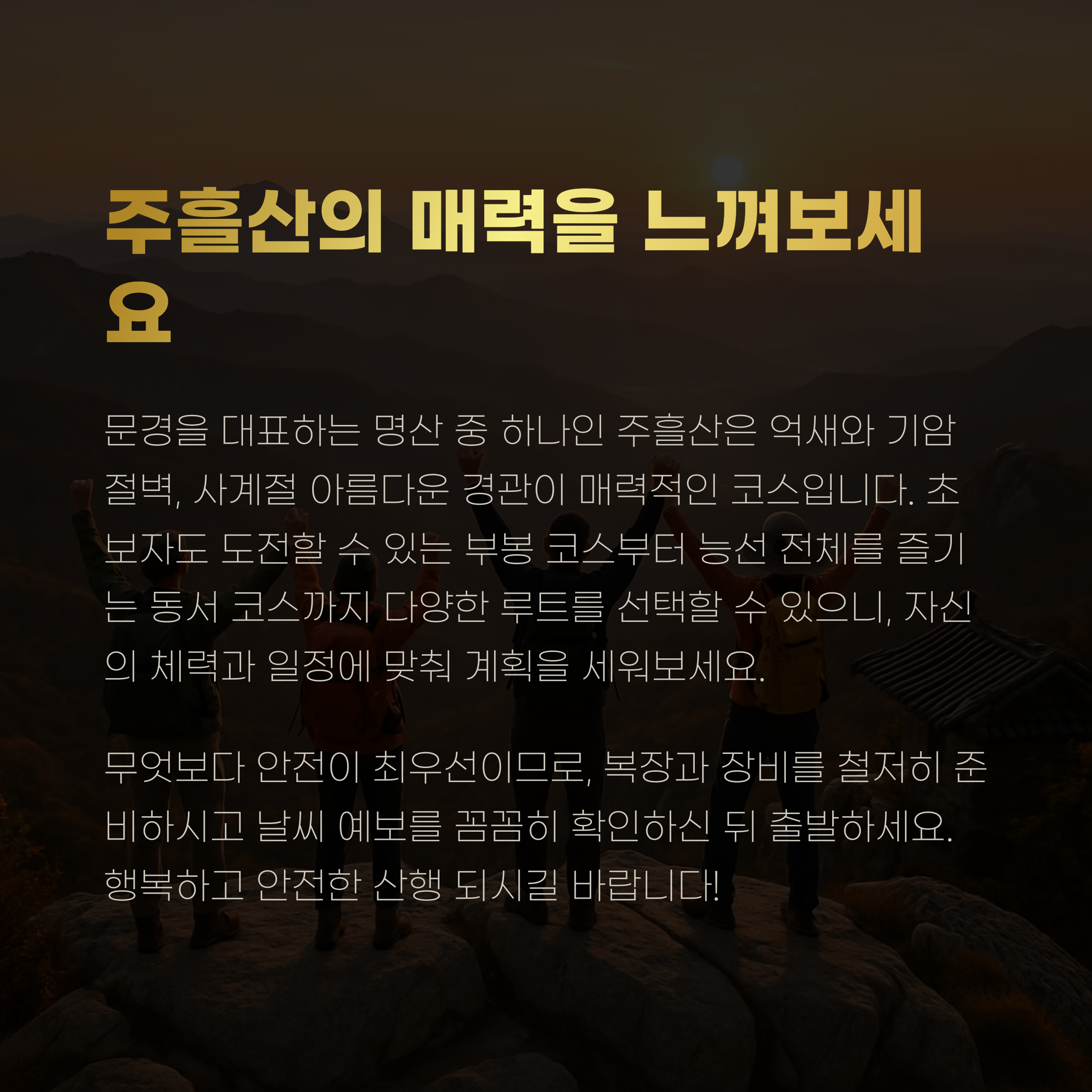오늘 소개해 드린 주흘산 등산코스는 문경을 대표하는 명산 중 하나로, 억새와 기암절벽, 사계절 아름다운 경관이 매력적인 코스입니다. 초보자도 도전할 수 있는 부봉 코스부터 능선 전체를 즐기는 동서 코스까지 다양한 루트를 선택할 수 있으니, 자신의 체력과 일정에 맞춰 계획을 세워보시기 바랍니다. 무엇보다 안전이 최우선이므로, 복장과 장비를 철저히 준비하시고 날씨 예보를 꼼꼼히 확인하신 뒤 출발하세요. 행복하고 안전한 산행 되시길 바랍니다!
