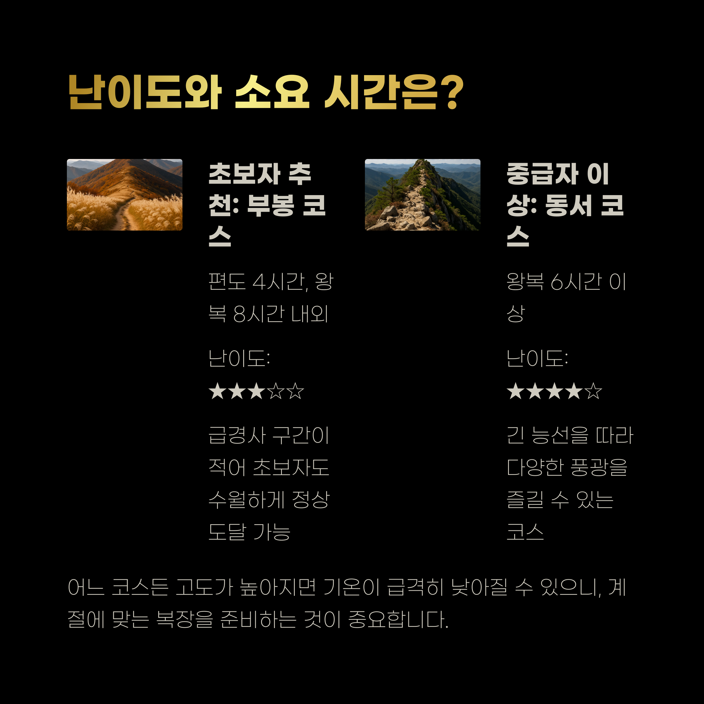 - 초보자 추천 코스: 부봉 코스 (편도 4시간, 왕복 8시간 내외 계획)