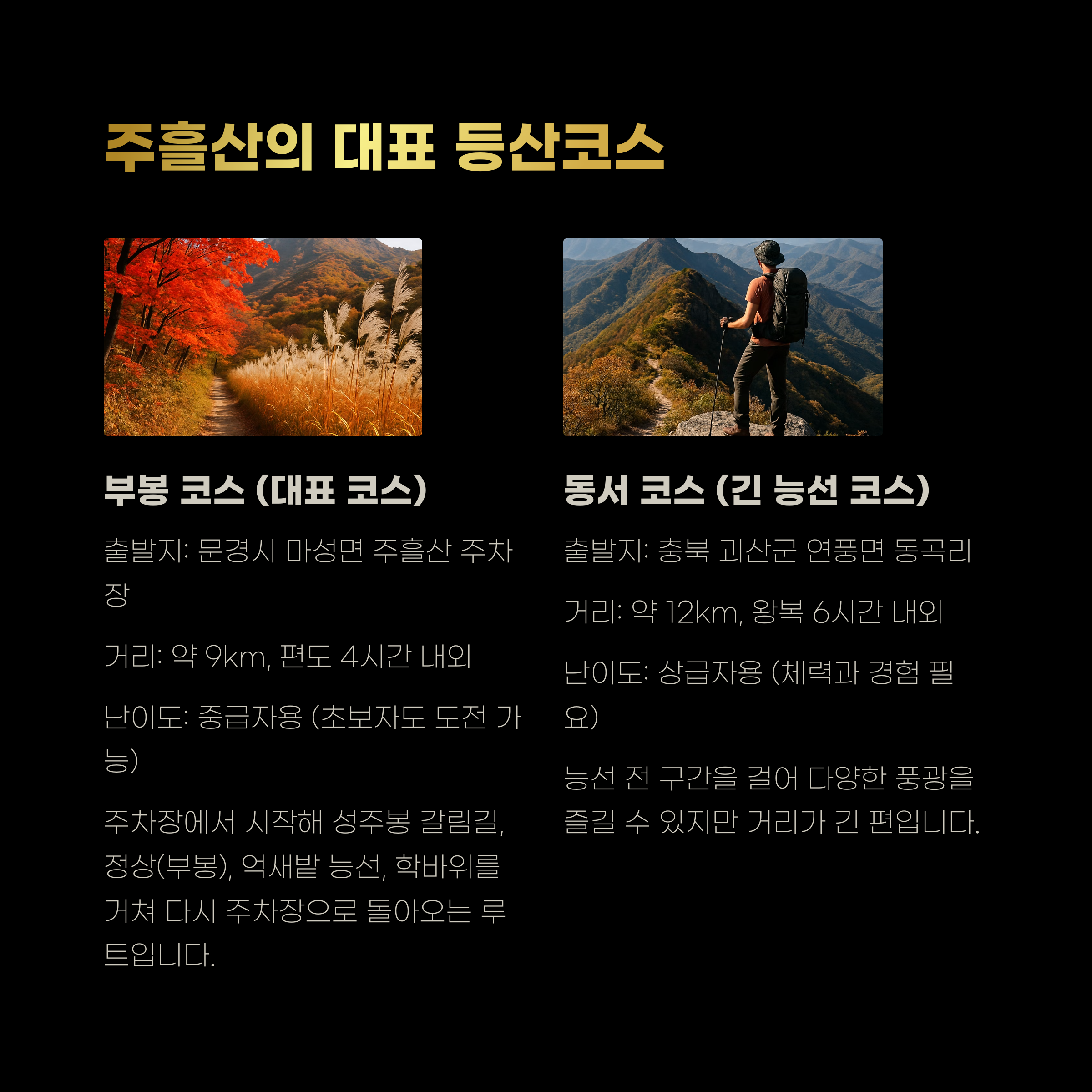 안녕하세요! 오늘은 경상북도 문경의 명산, 주흘산 등산코스를 소개해 드립니다. 주흘산은 해발 약 1,331m의 높이로, 억새밭과 기암절벽이 어우러진 경치가 매력적인 산입니다. 특히 주흘산은 사계절 내내 풍경이 아름답기로 유명하여 많은 등산객들에게 사랑받고 있습니다. 이 글에서는 초보자부터 숙련자까지 모두 도전해볼 만한 주흘산 등산코스를 상세히 안내해드리니, 안전하고 즐거운 산행을 계획하실 때 참고해 보세요.