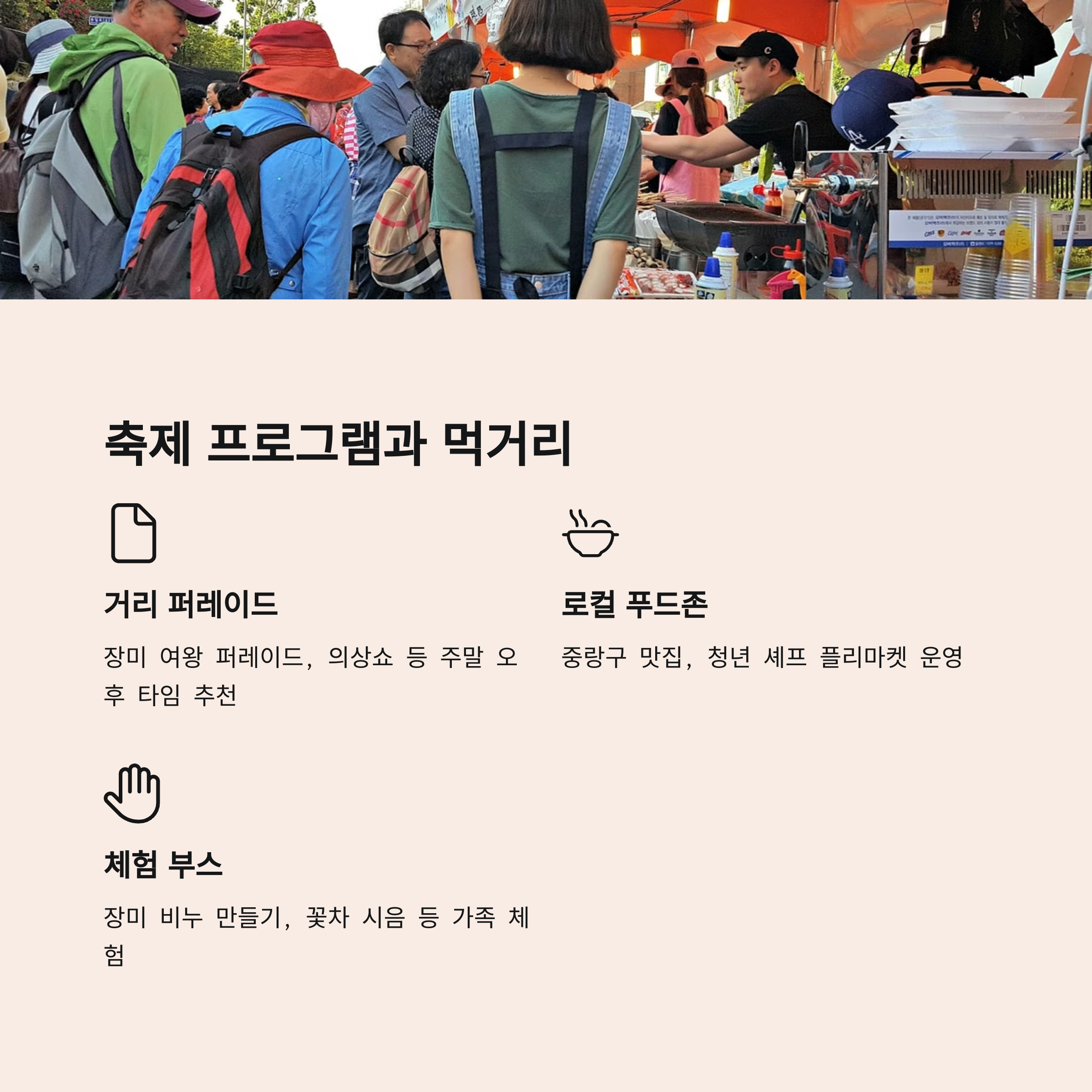 | 로컬 푸드존 | 중랑구 맛집, 청년 셰프 플리마켓 운영 | 텐트형 부스, 야외 먹거리 즐기기 가능 |