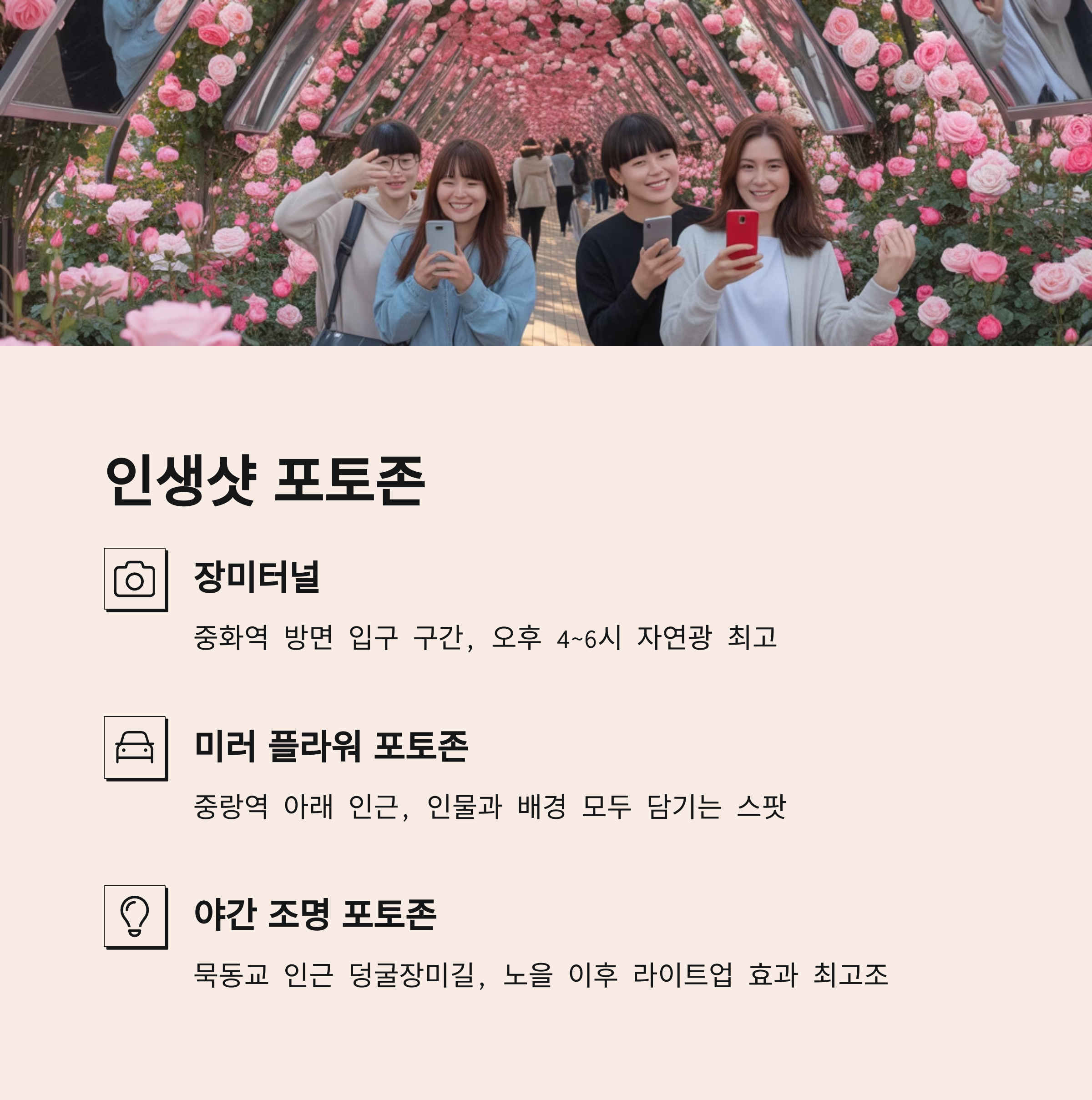 | 미러 플라워 포토존 | 중랑역 아래 인근 | 인물+배경 모두 담기는 스팟 |