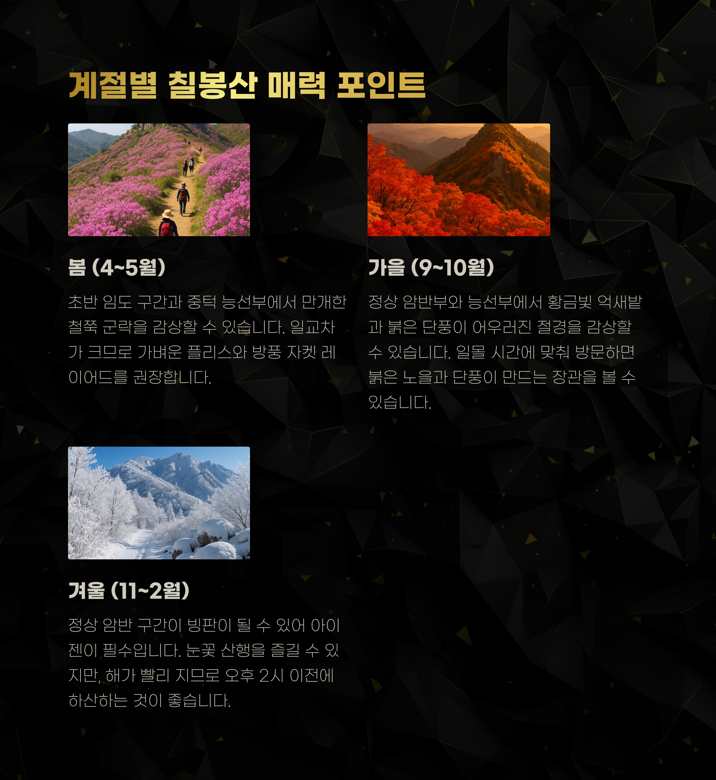 • 특징: 일곱 개의 봉우리가 연이어진 능선과 사계절 변화가 뚜렷한 명산으로, 인파가 적어 쾌적한 트레킹이 가능함. 초급자·가족 단위도 부담 없이 즐길 수 있으며 사진 애호가에게도 추천할 만함. 봄에는 철쭉, 여름에는 계곡과 숲 그늘, 가을에는 단풍과 억새, 겨울에는 설경과 눈꽃을 감상할 수 있음.