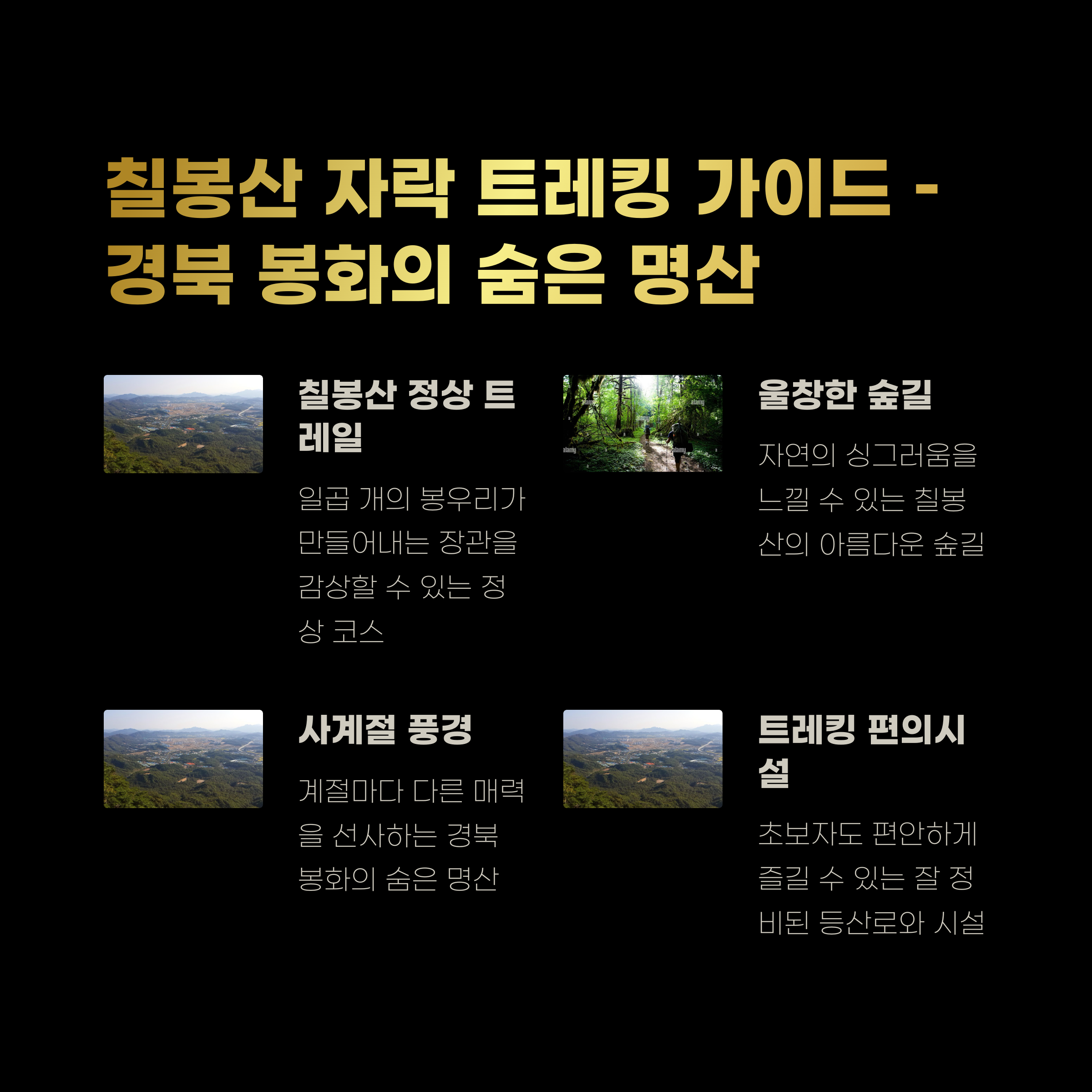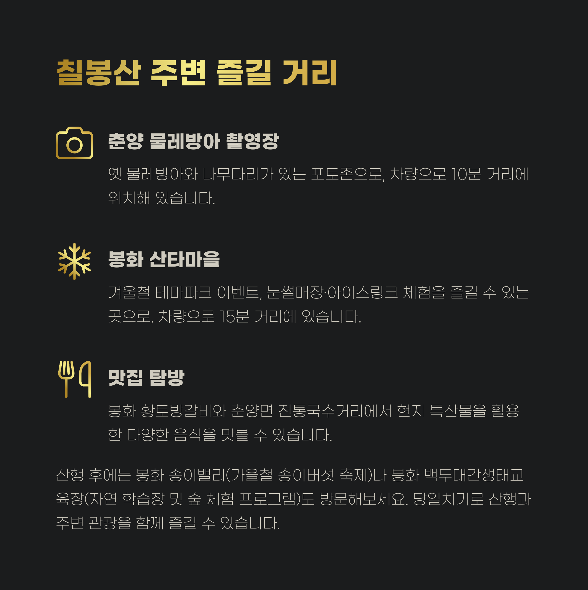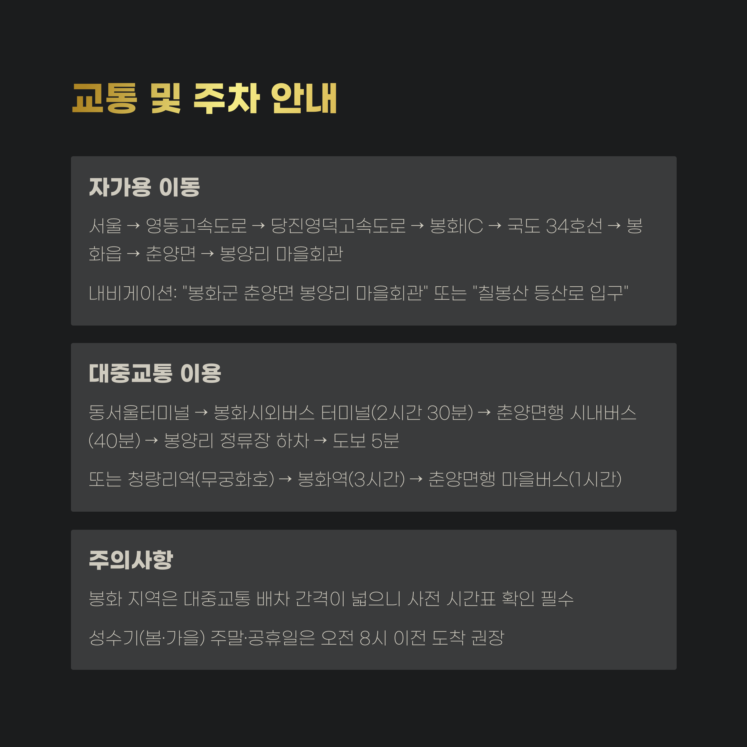 - 내비 입력: “봉화군 춘양면 봉양리 마을회관” 또는 “칠봉산 등산로 입구”