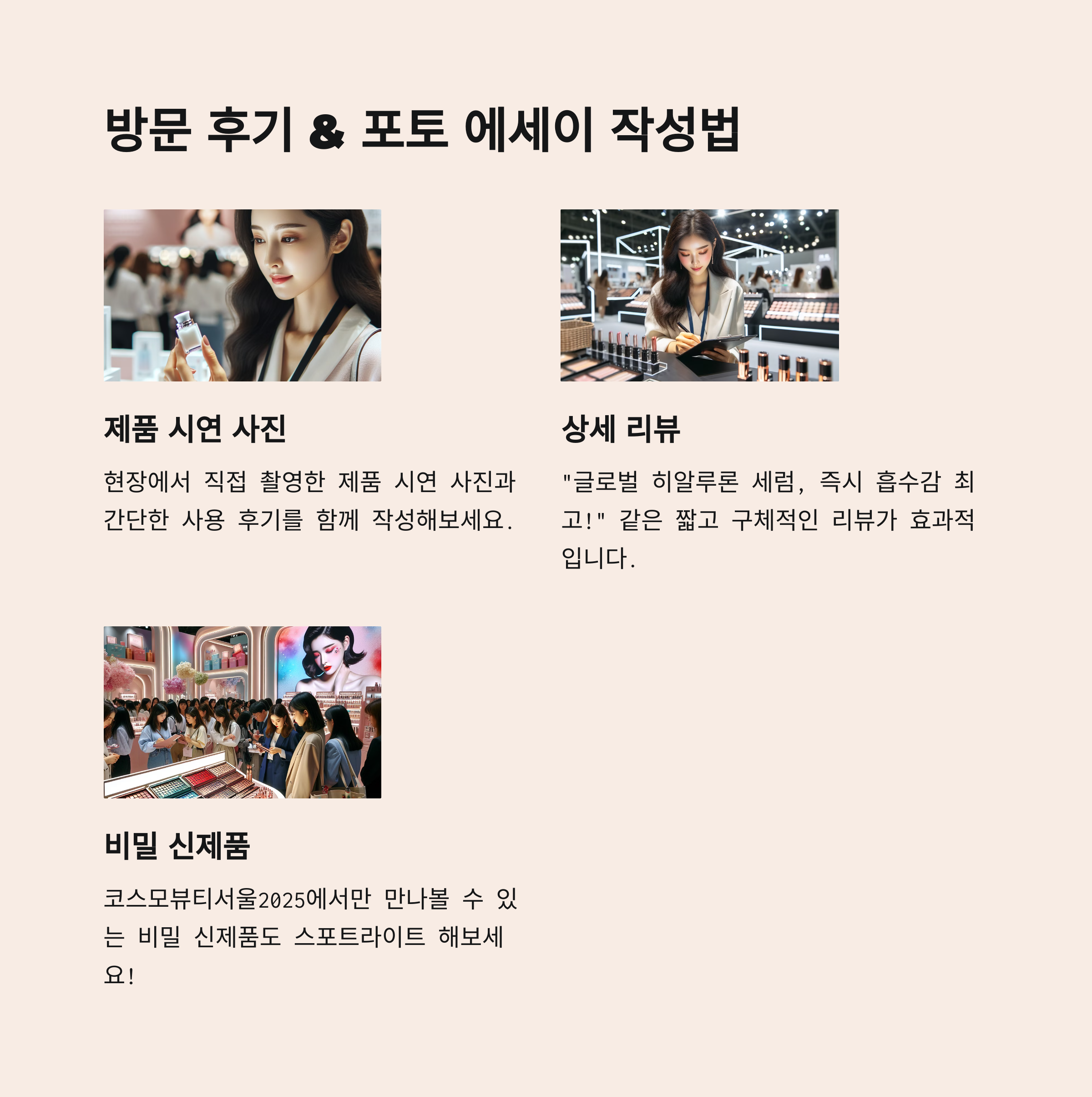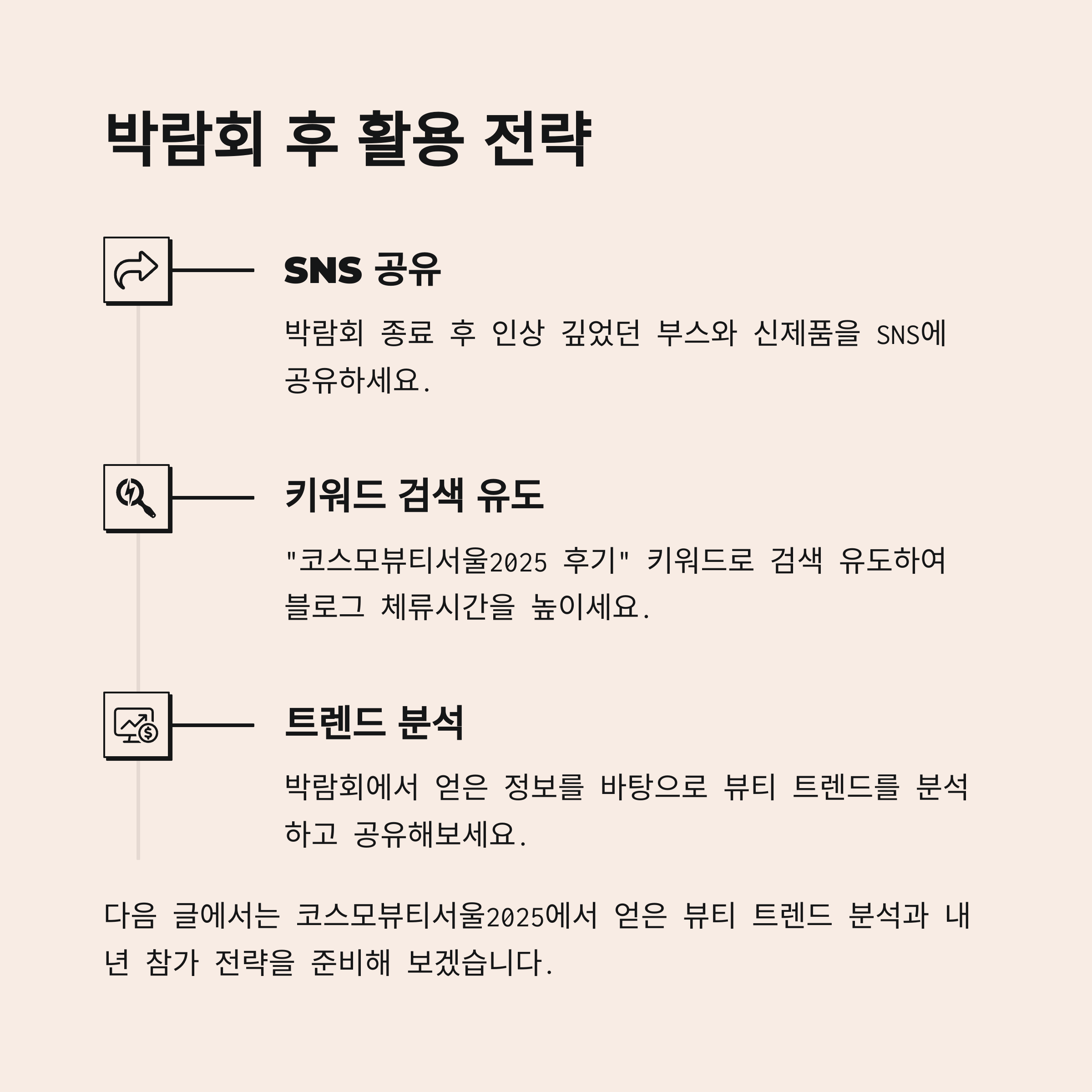 - “코스모뷰티서울2025 후기” 키워드로 검색 유도 → 블로그 체류시간 UP