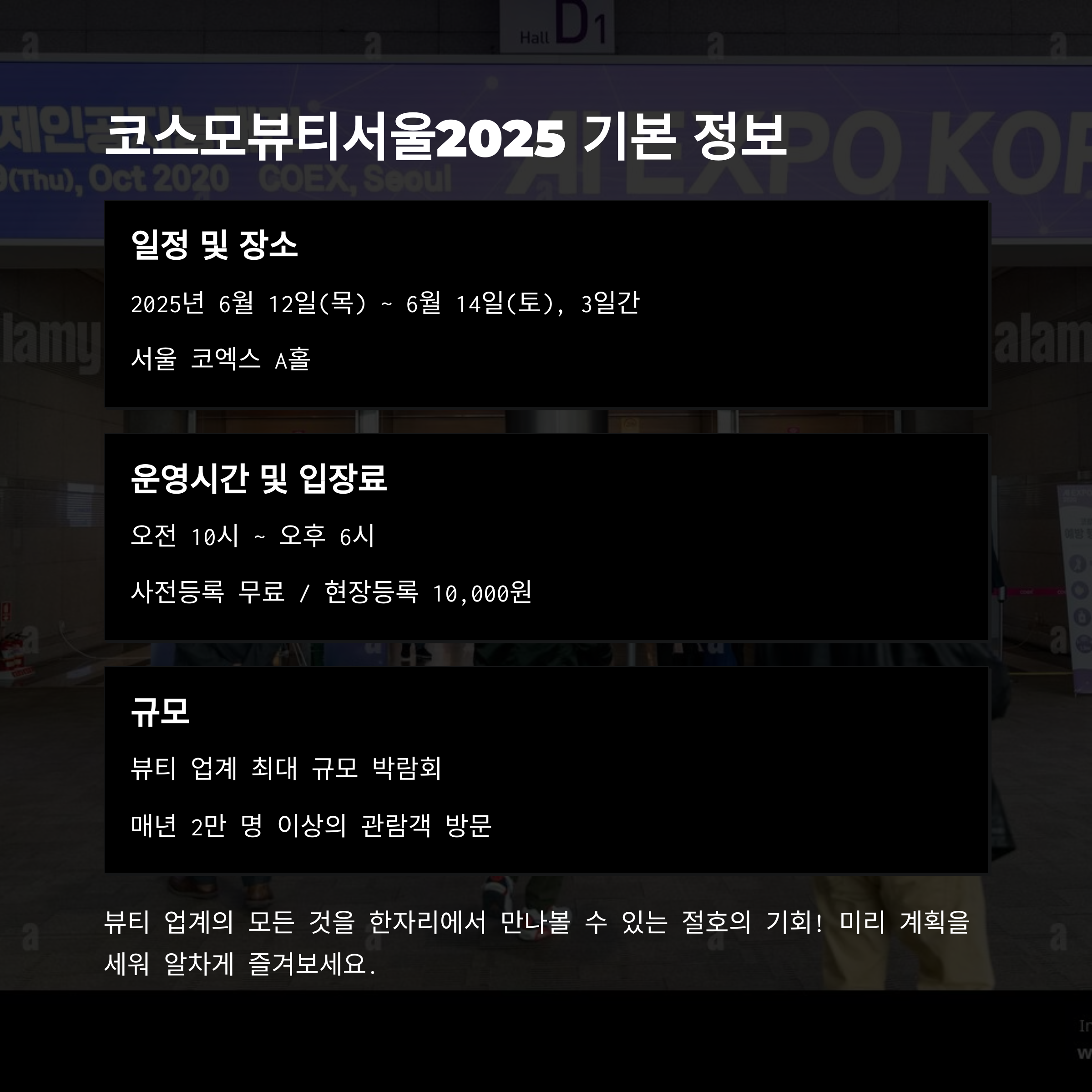 “코스모뷰티서울2025”는 뷰티 업계 최대 규모 박람회로 매년 2만 명 이상의 관람객이 방문합니다.