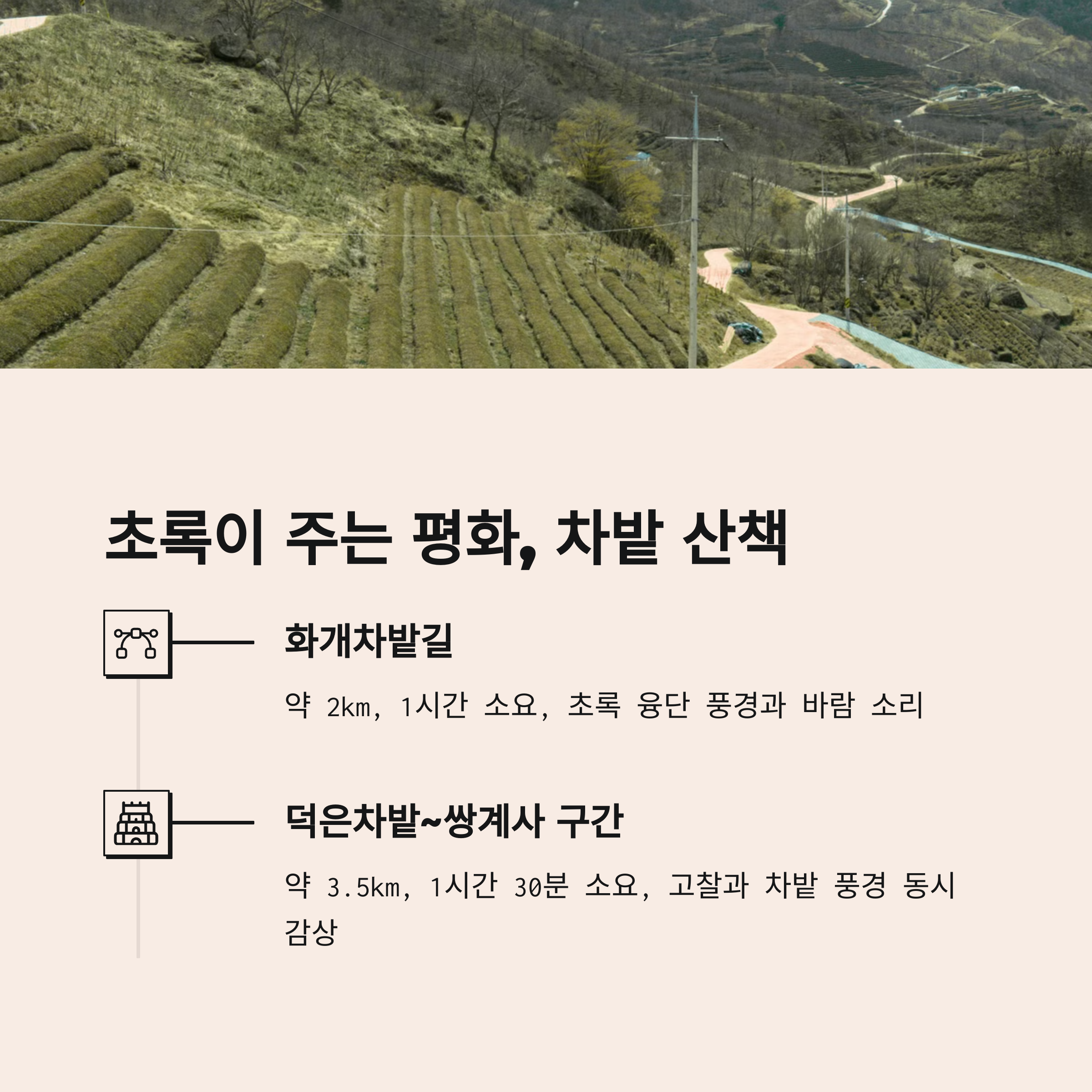 | 덕은차밭~쌍계사 구간 | 약 3.5킬로미터, 1시간 30분 | 고찰과 차밭 풍경을 함께 즐길 수 있음 |