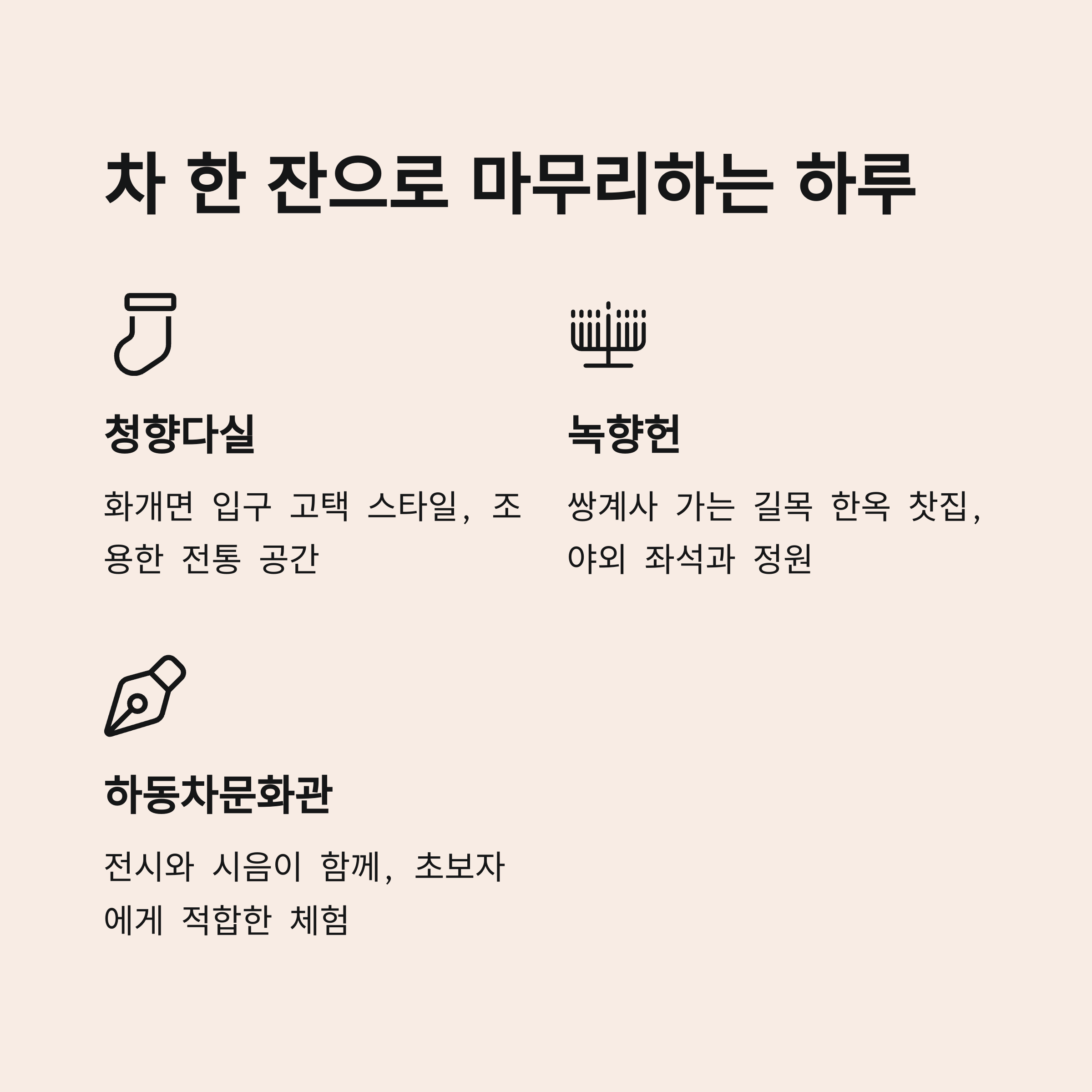 | 하동차문화관 | 전시와 시음이 함께 운영 | 초보자에게 적합한 체험 위주 |