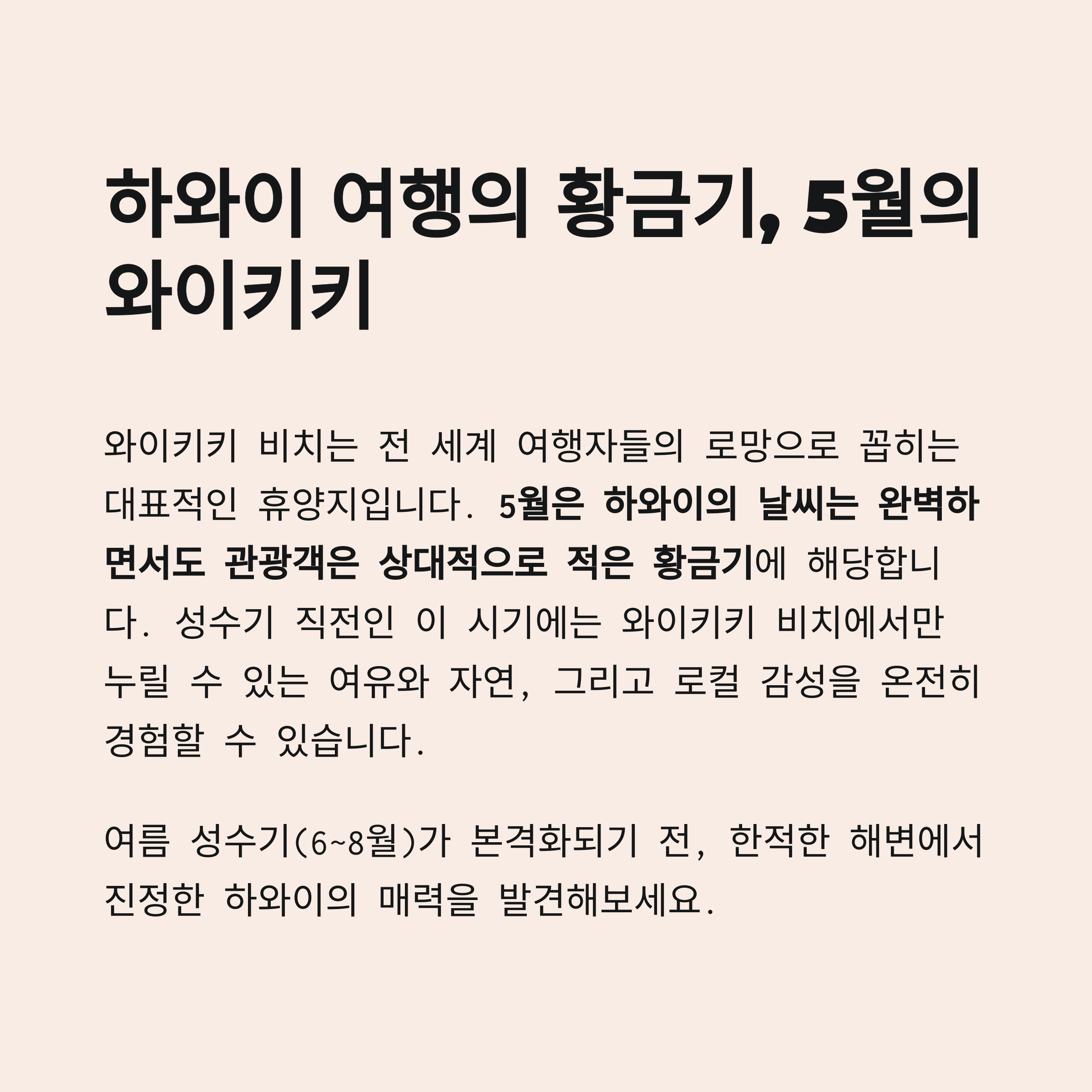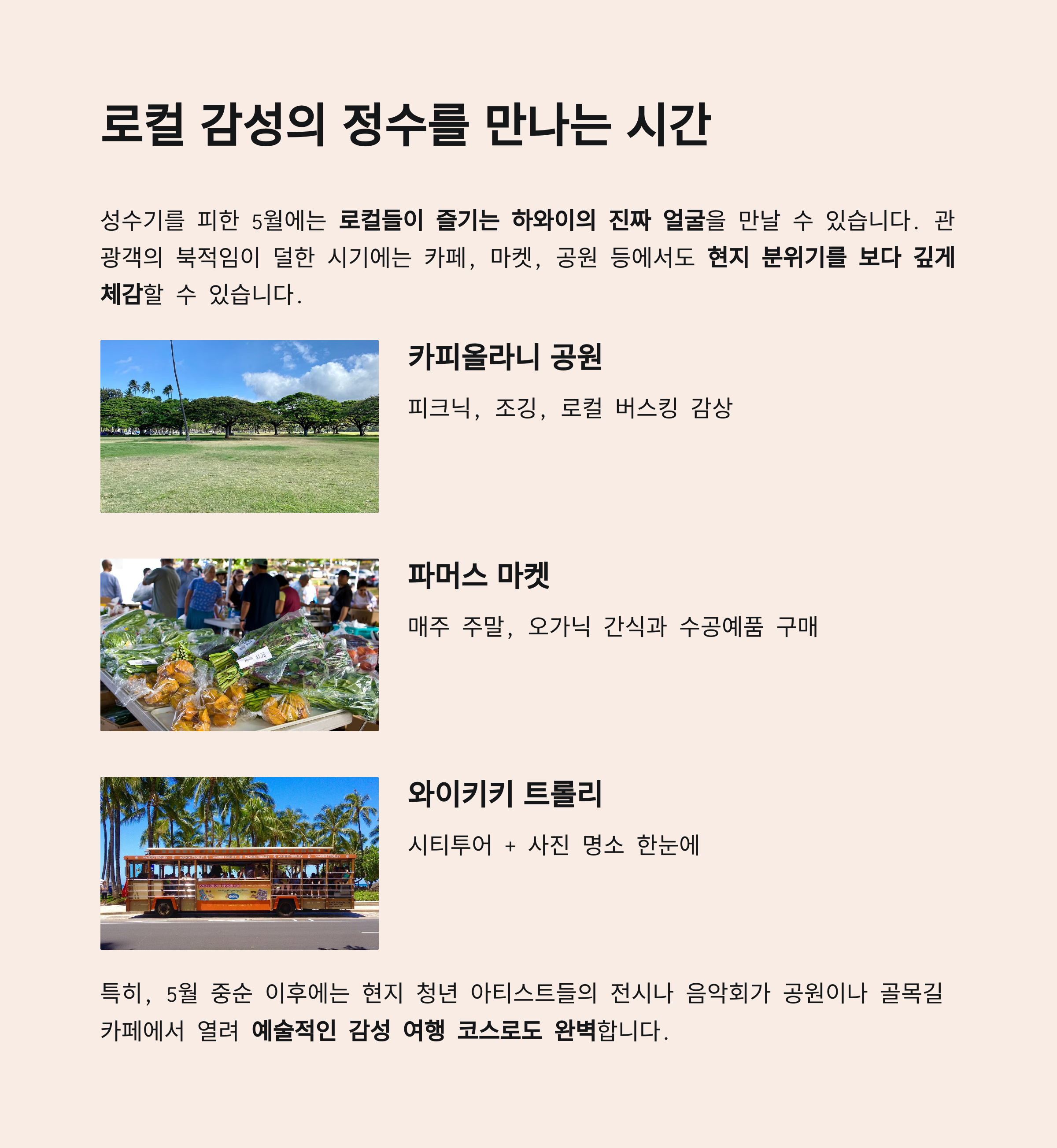 성수기를 피한 5월에는 로컬들이 즐기는 하와이의 진짜 얼굴을 만날 수 있습니다.