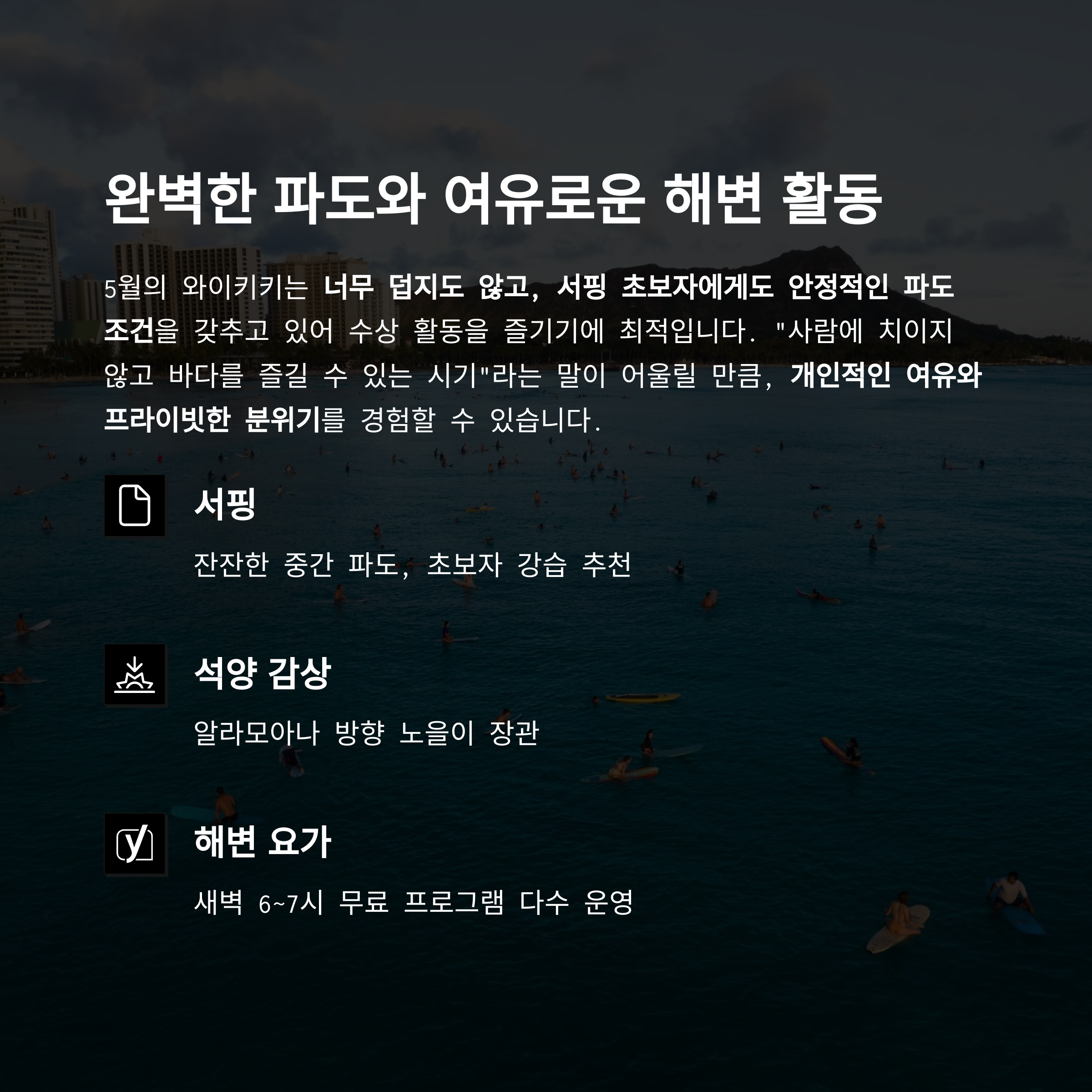 이번 글에서는 성수기 직전 5월의 하와이 와이키키 비치에서만 누릴 수 있는 여유와