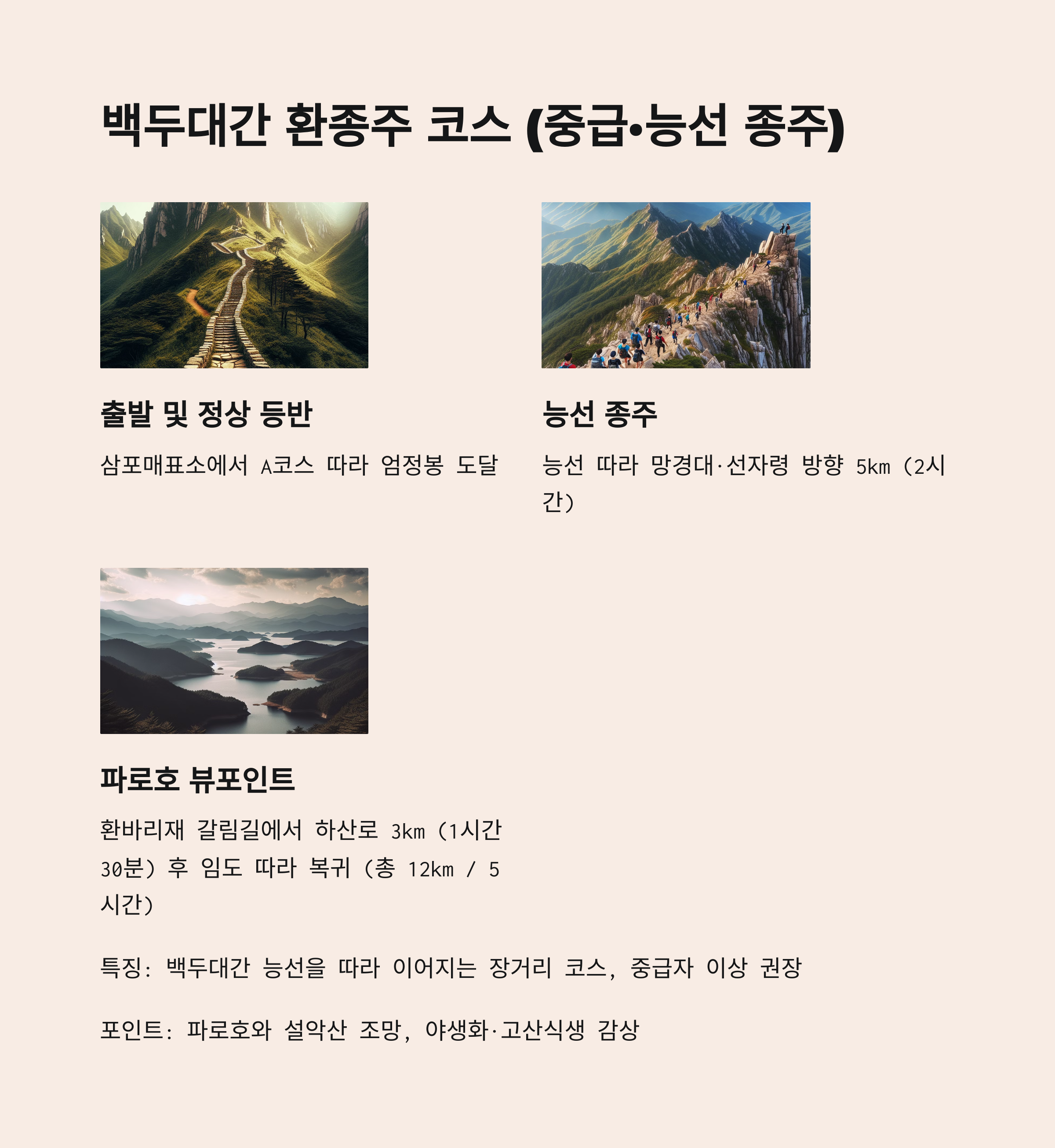 - 특징: 백두대간 능선을 따라 이어지는 장거리 코스, 중급자 이상 권장