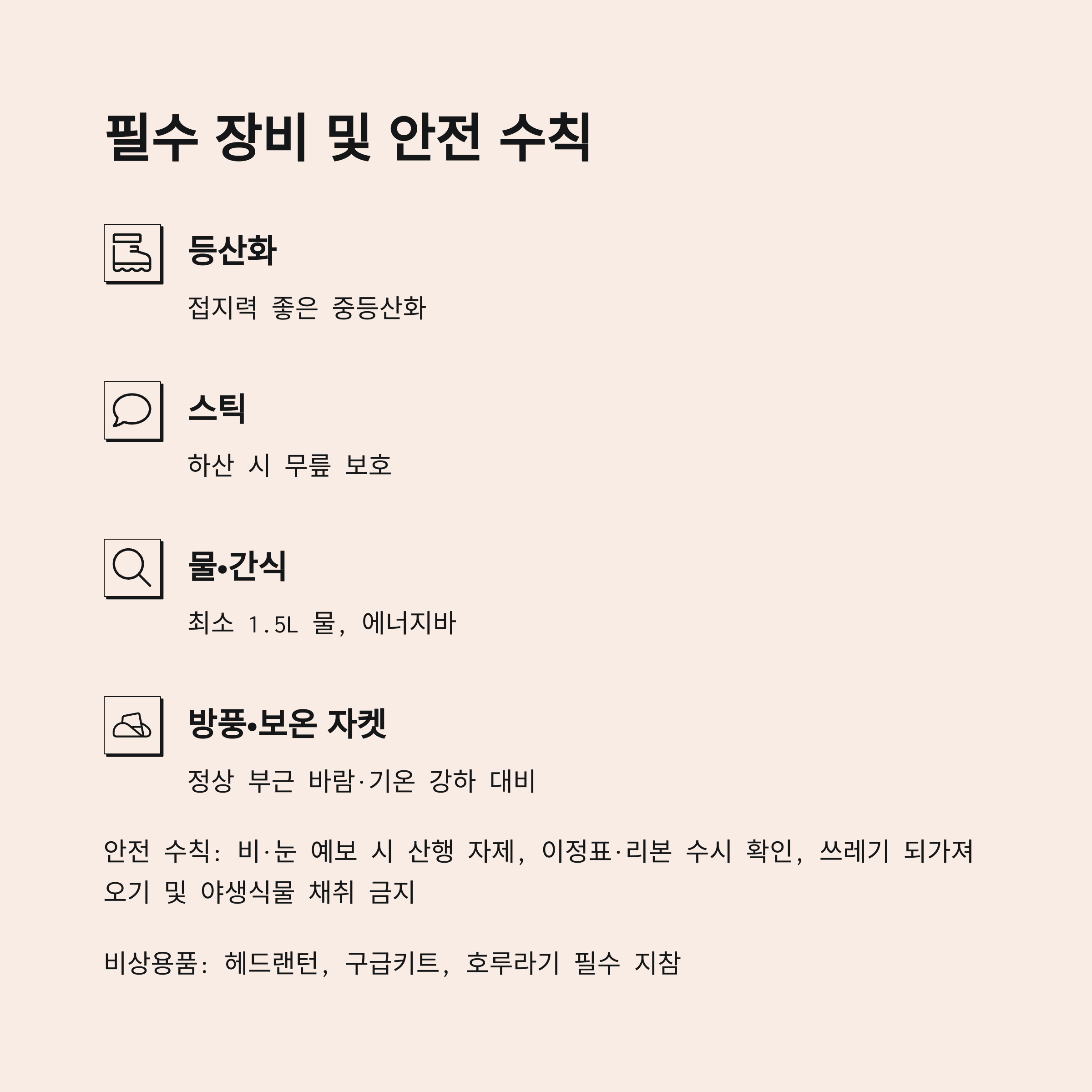 - 방풍·보온 자켓: 정상 부근 바람·기온 강하 대비