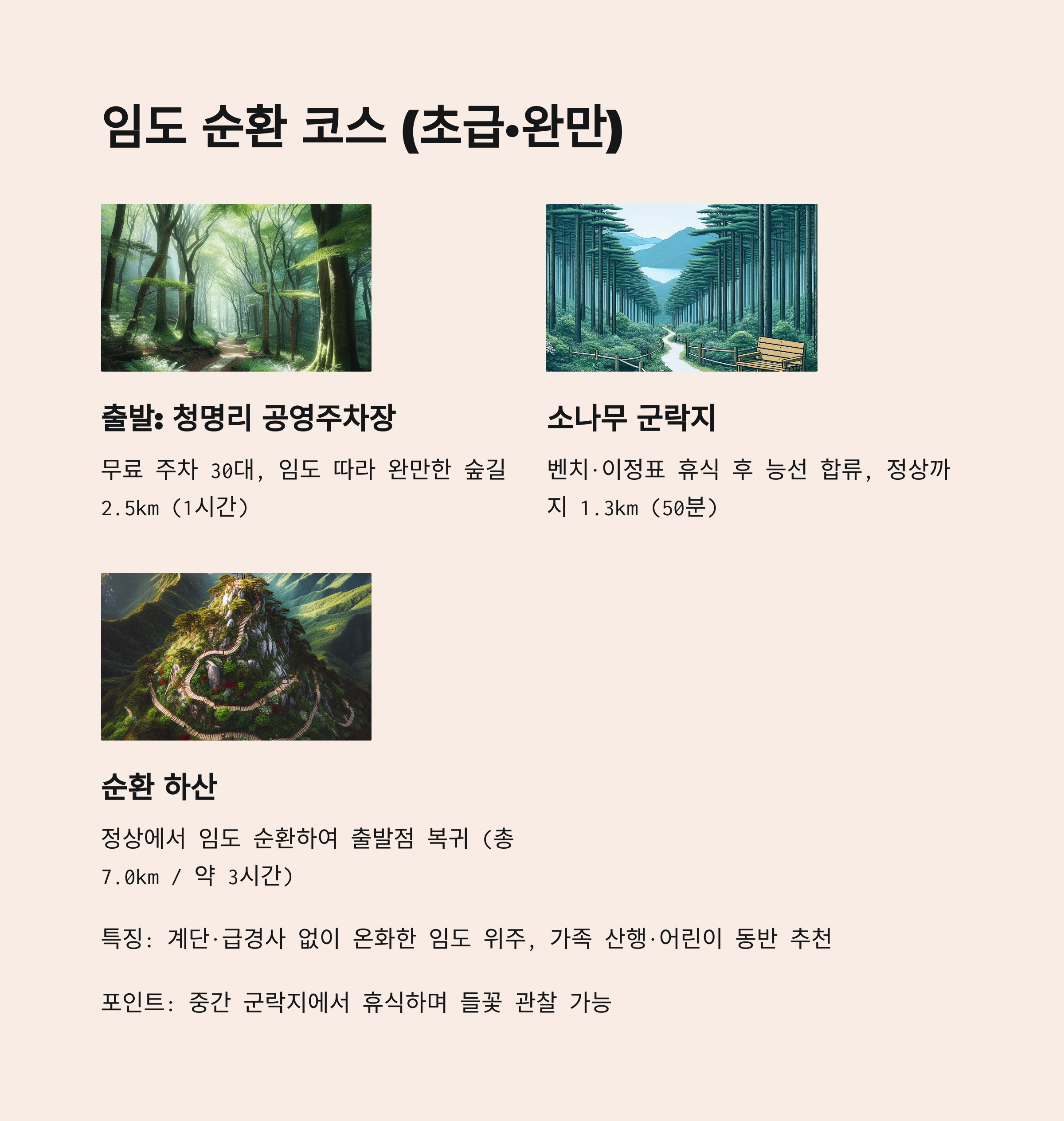 - 특징: 계단·급경사 없이 온화한 임도 위주, 가족 산행·어린이 동반 추천