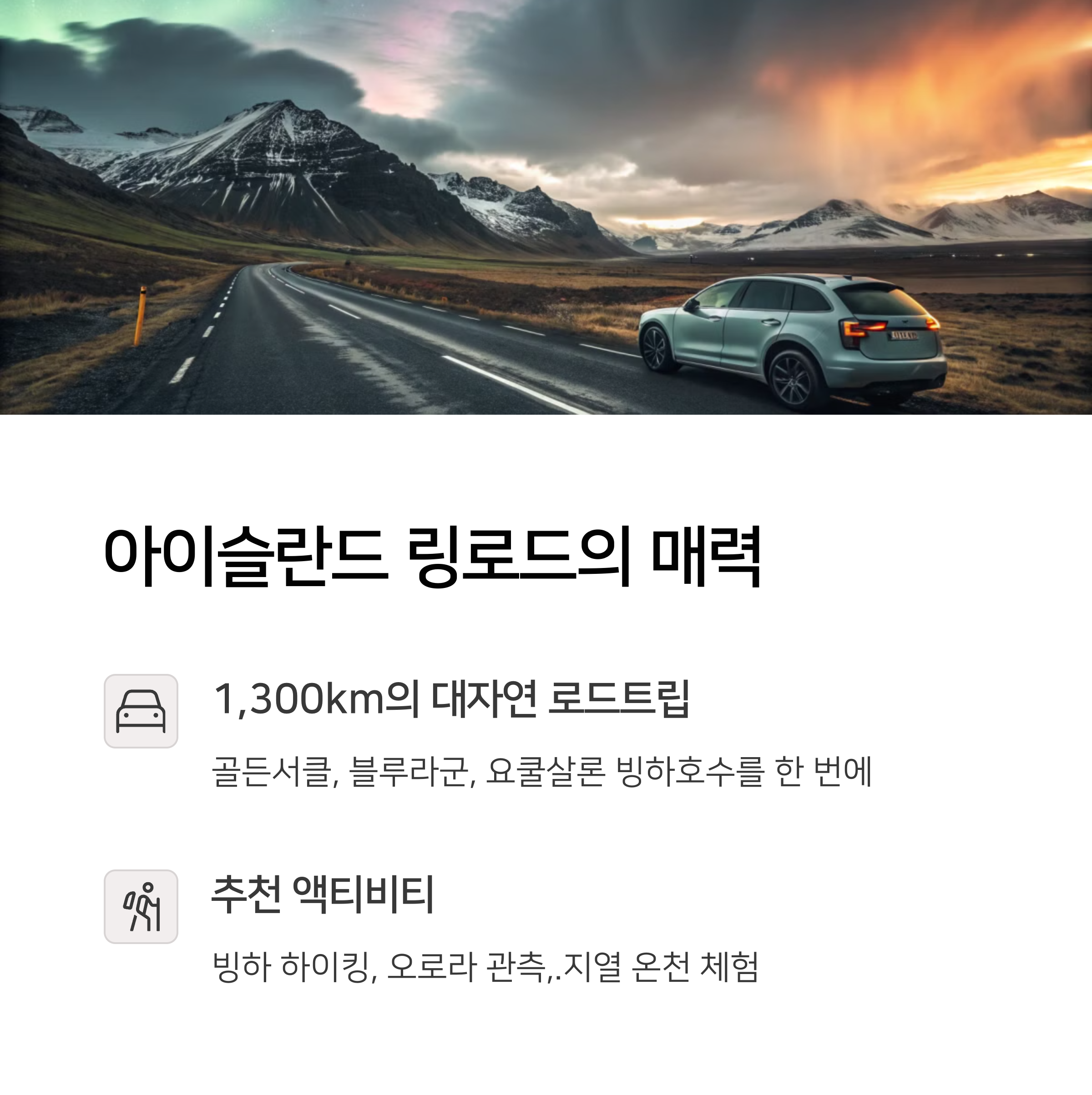 ✔️ 추천 이유: 한적한 도로를 따라 아이슬란드의 모든 자연경관을 감상할 수 있음