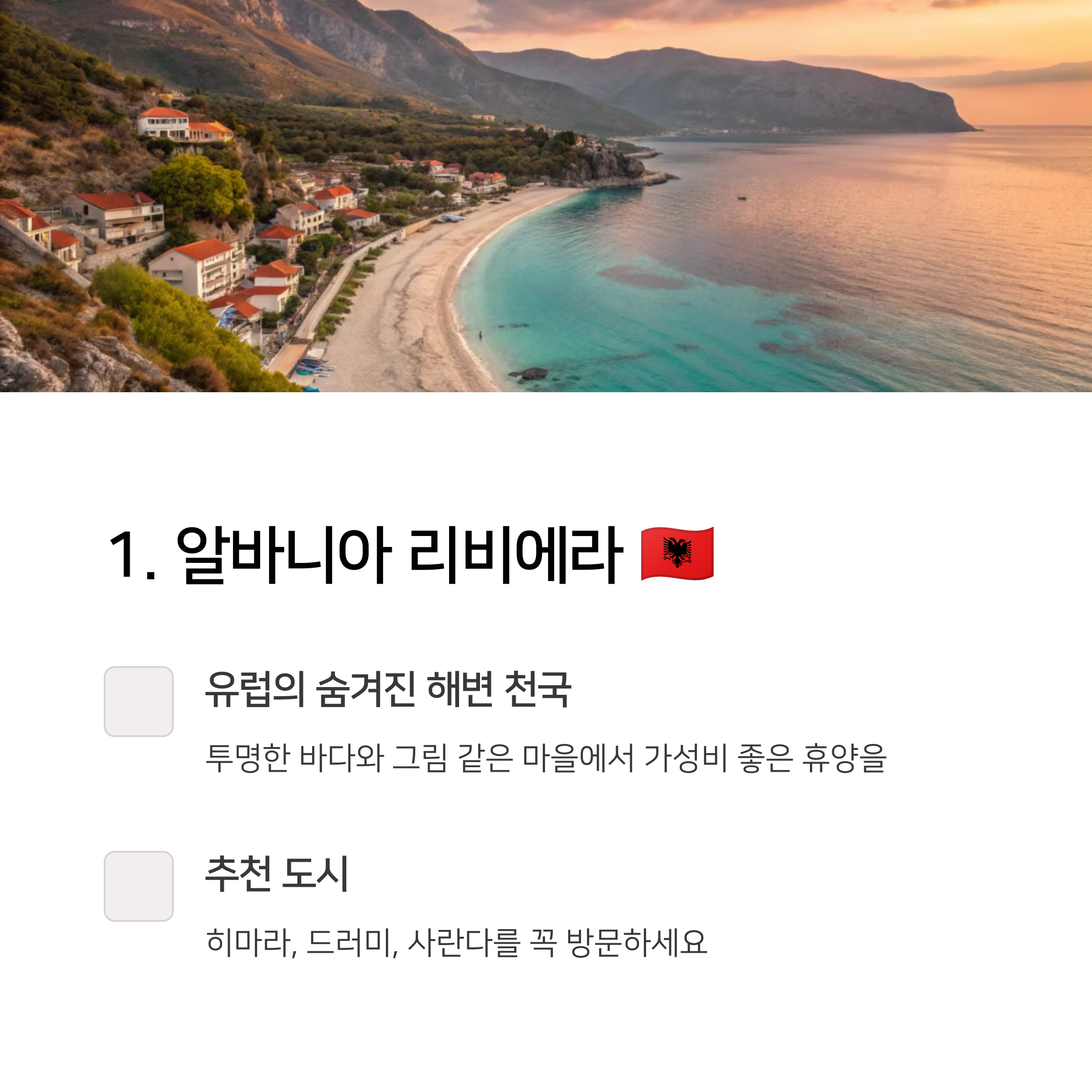 ✔ 주요 명소: 히마라(Himara), 드러미(Dhermi), 사란다(Saranda)