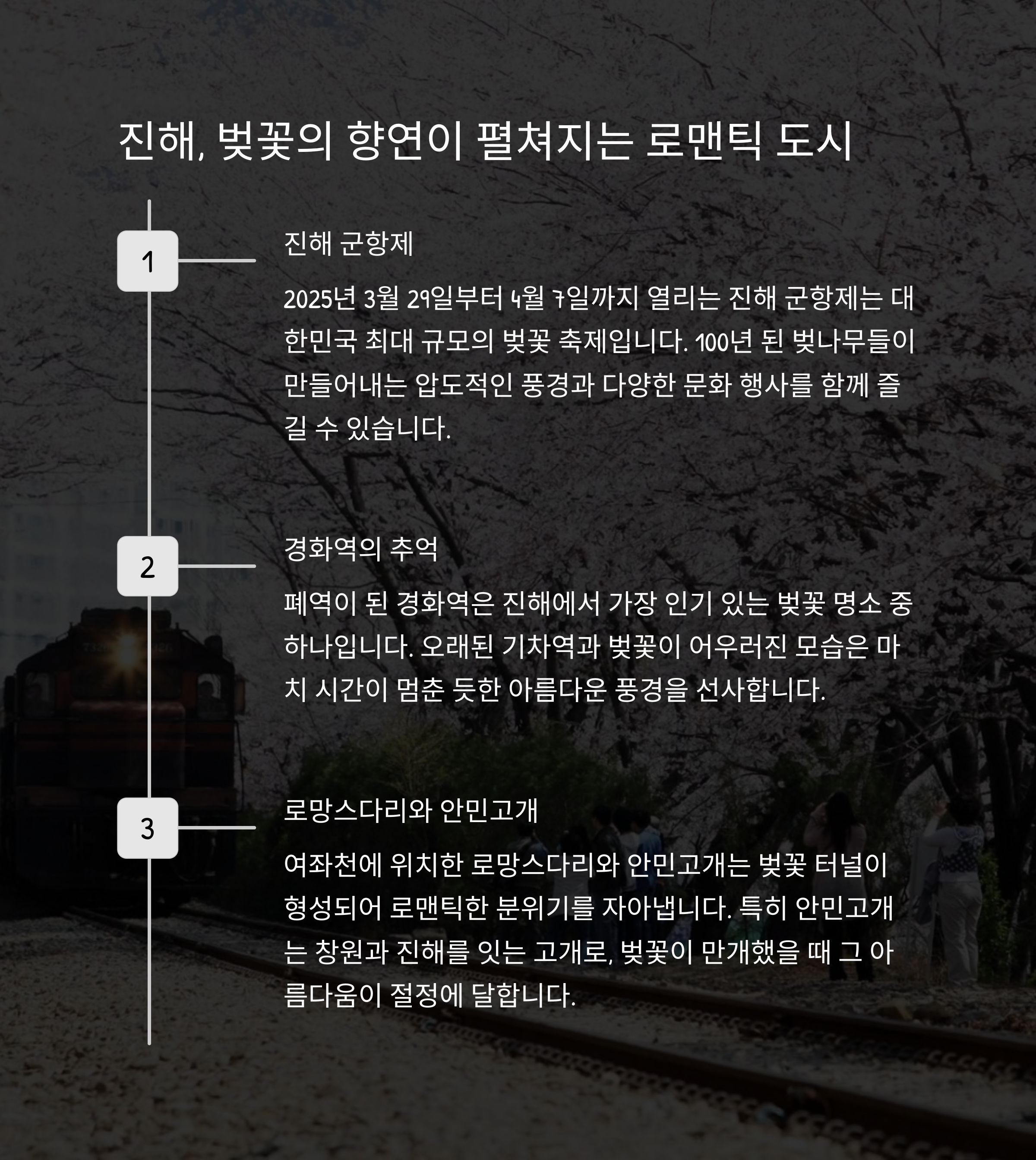 특징: 전국 최대 규모의 벚꽃 축제인 진해 군항제가 열리는 곳으로, 벚꽃 터널과 화려한 경관이 압도적입니다.