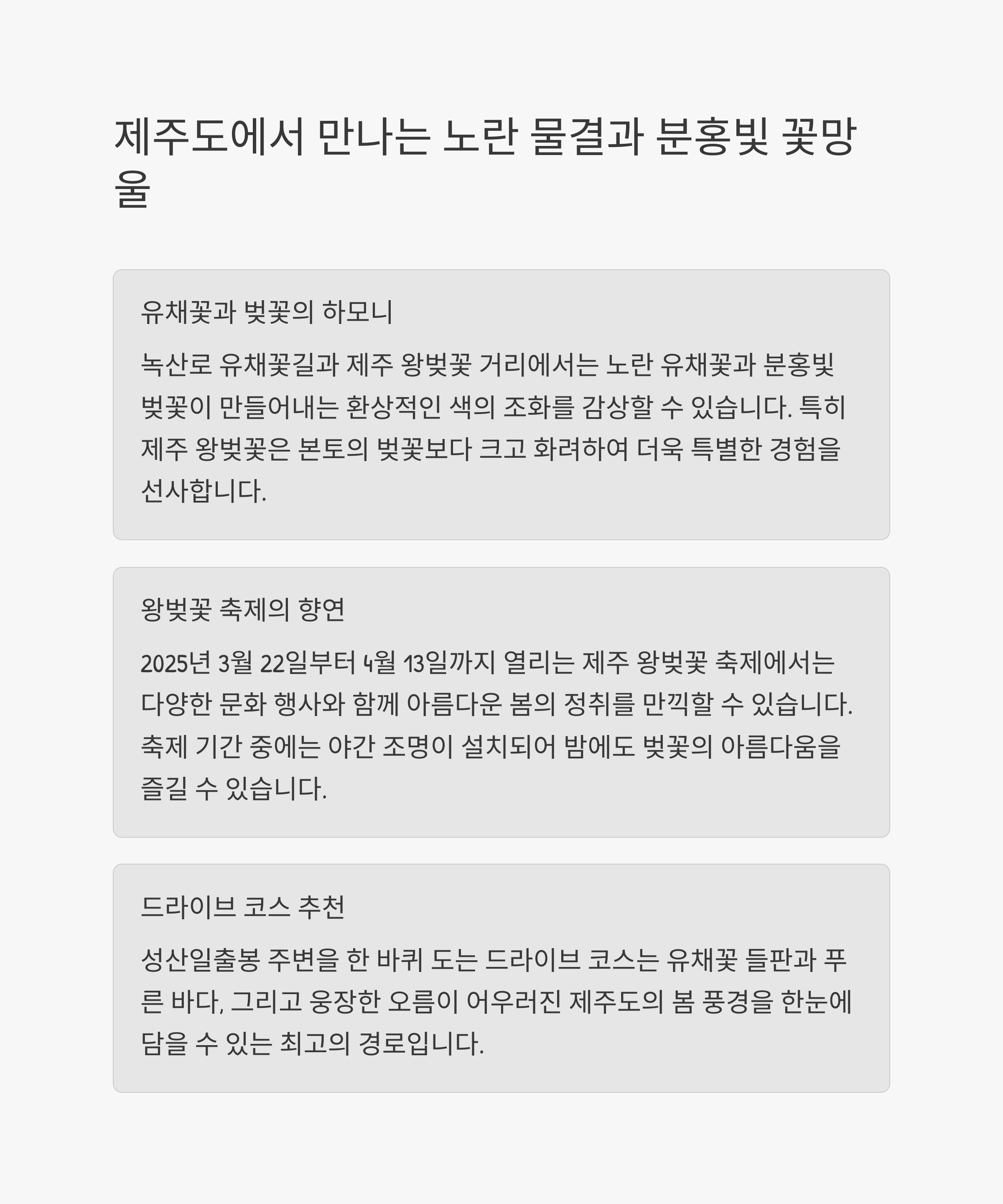 추천 장소: 녹산로 유채꽃길, 제주 왕벚꽃 거리, 성산일출봉