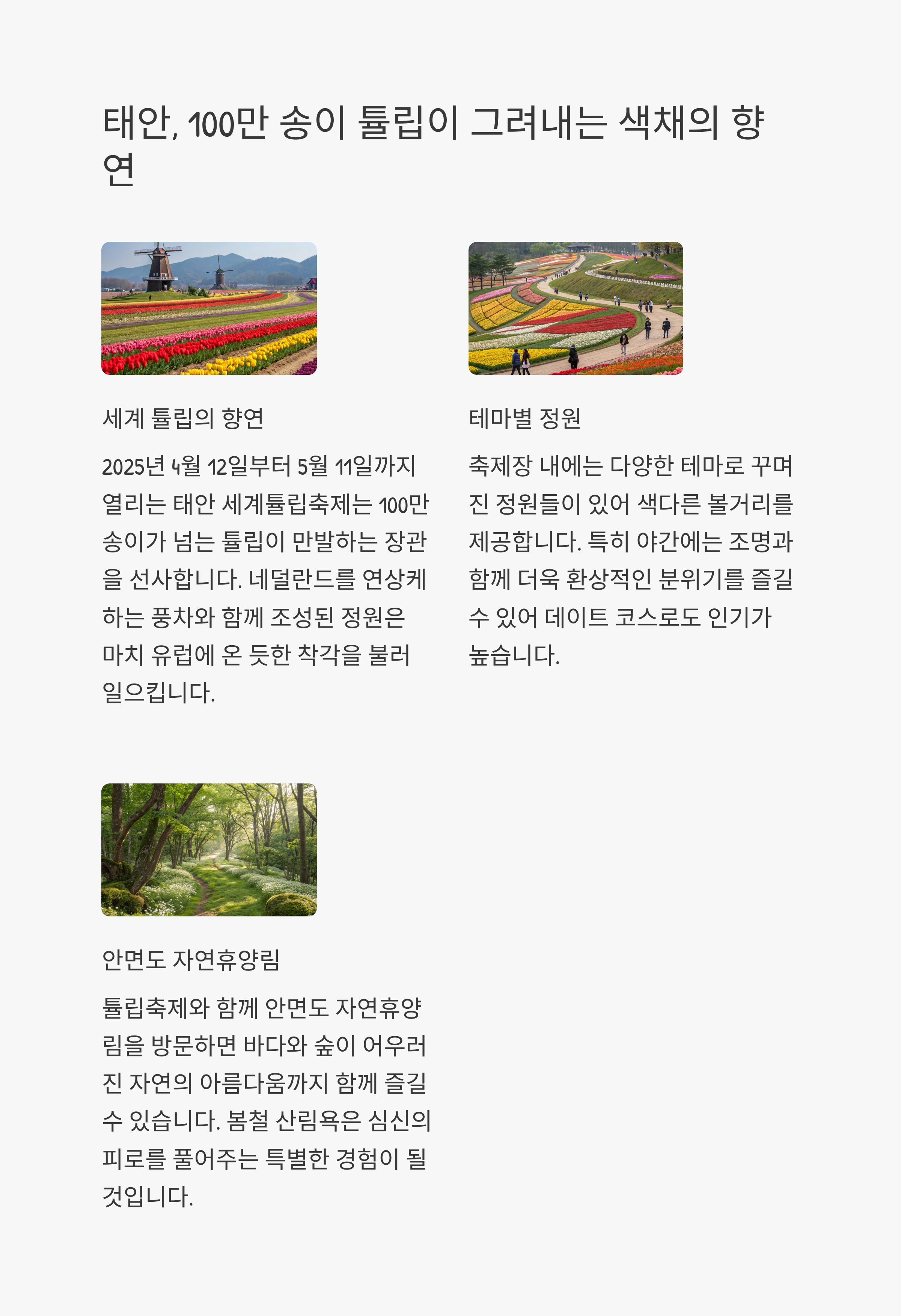 | 태안 세계 튤립 꽃박람회 | 충청남도 태안군 | 2025.04.08 ~ 2025.05.06 |