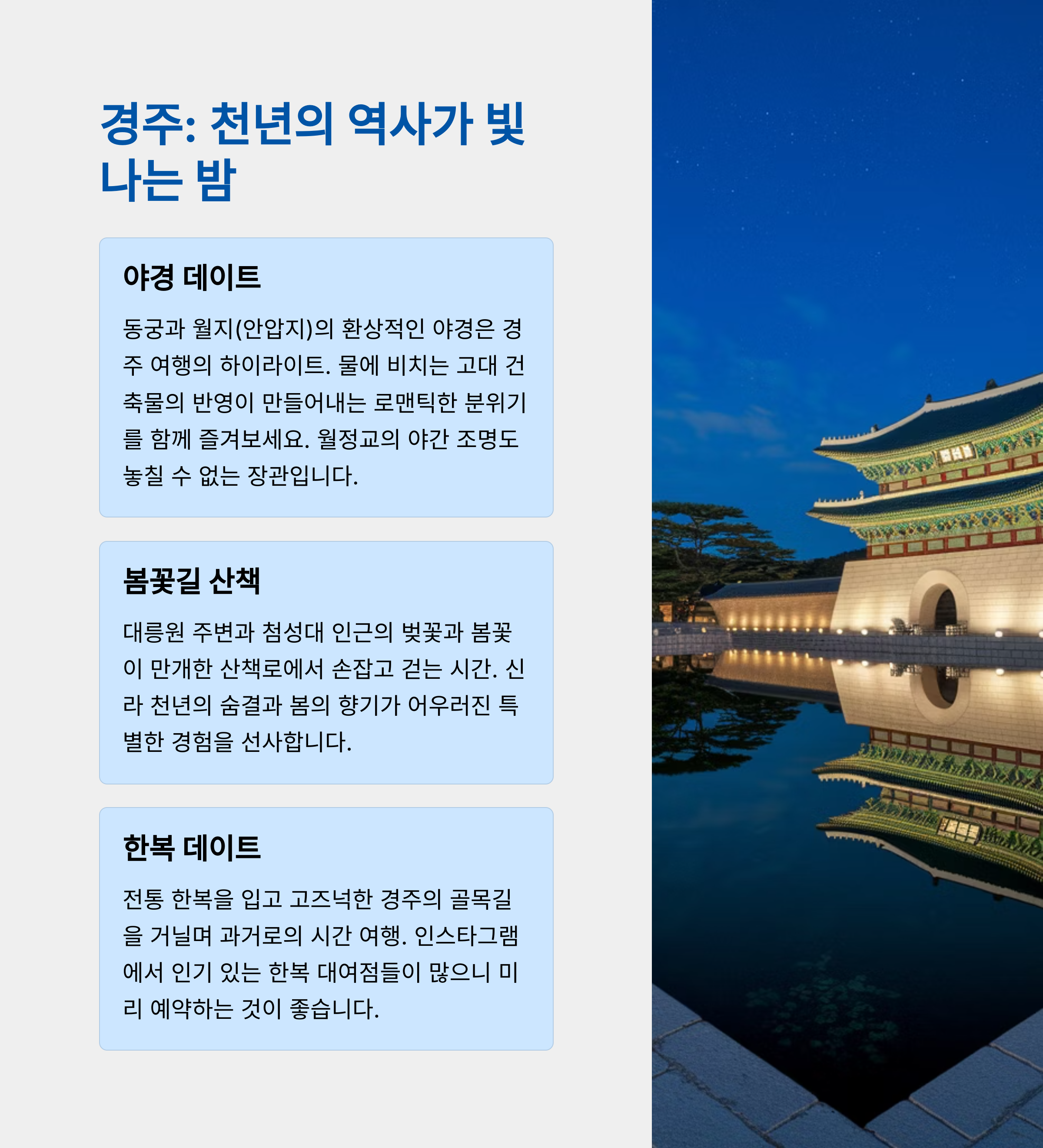 💡 팁: 야간 조명이 켜진 동궁과 월지는 고백하거나 기념하기에 완벽한 장소입니다.