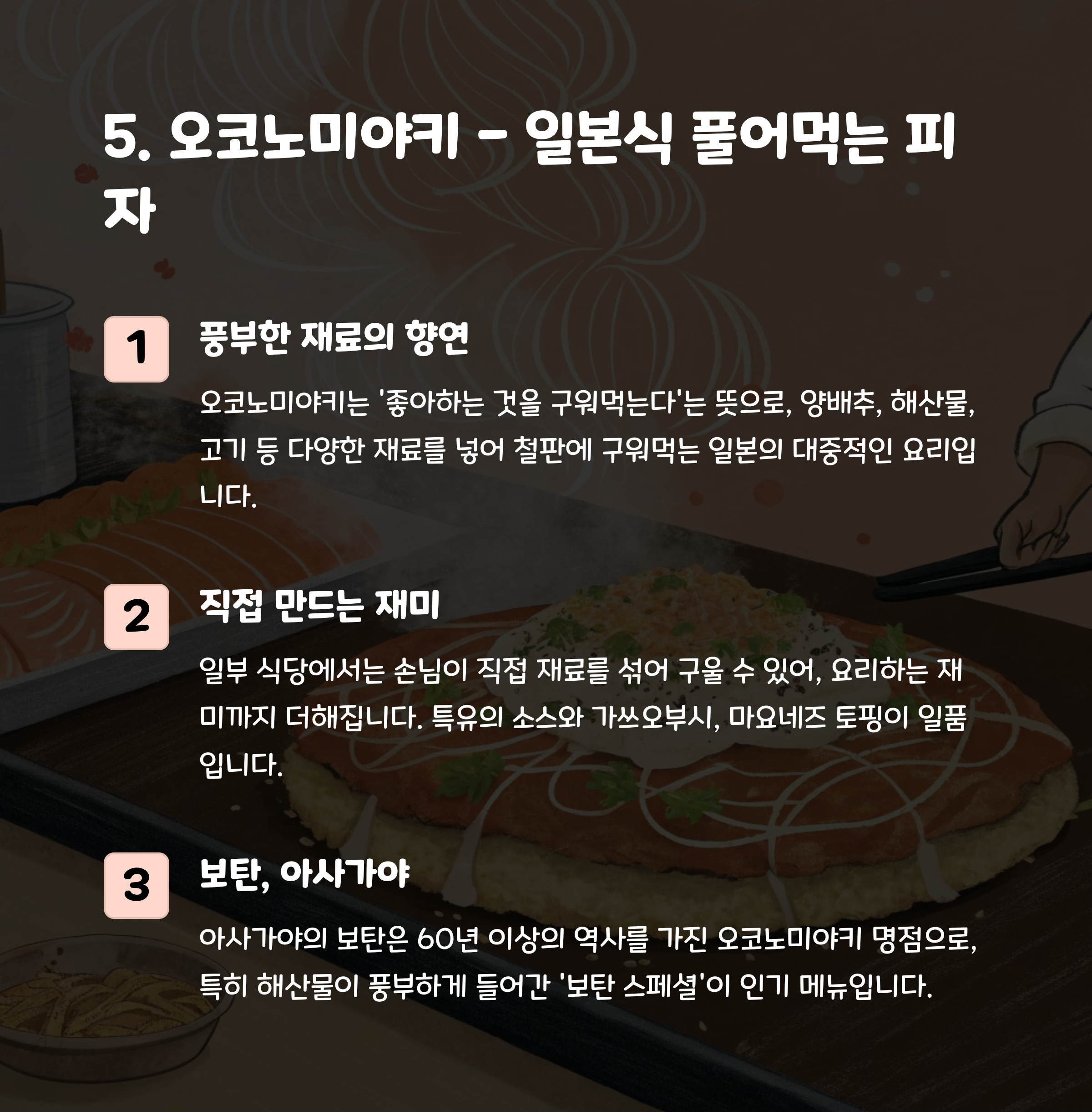 📍 4. 오코노미야키 (Okonomiyaki) – 일본식 부침개
