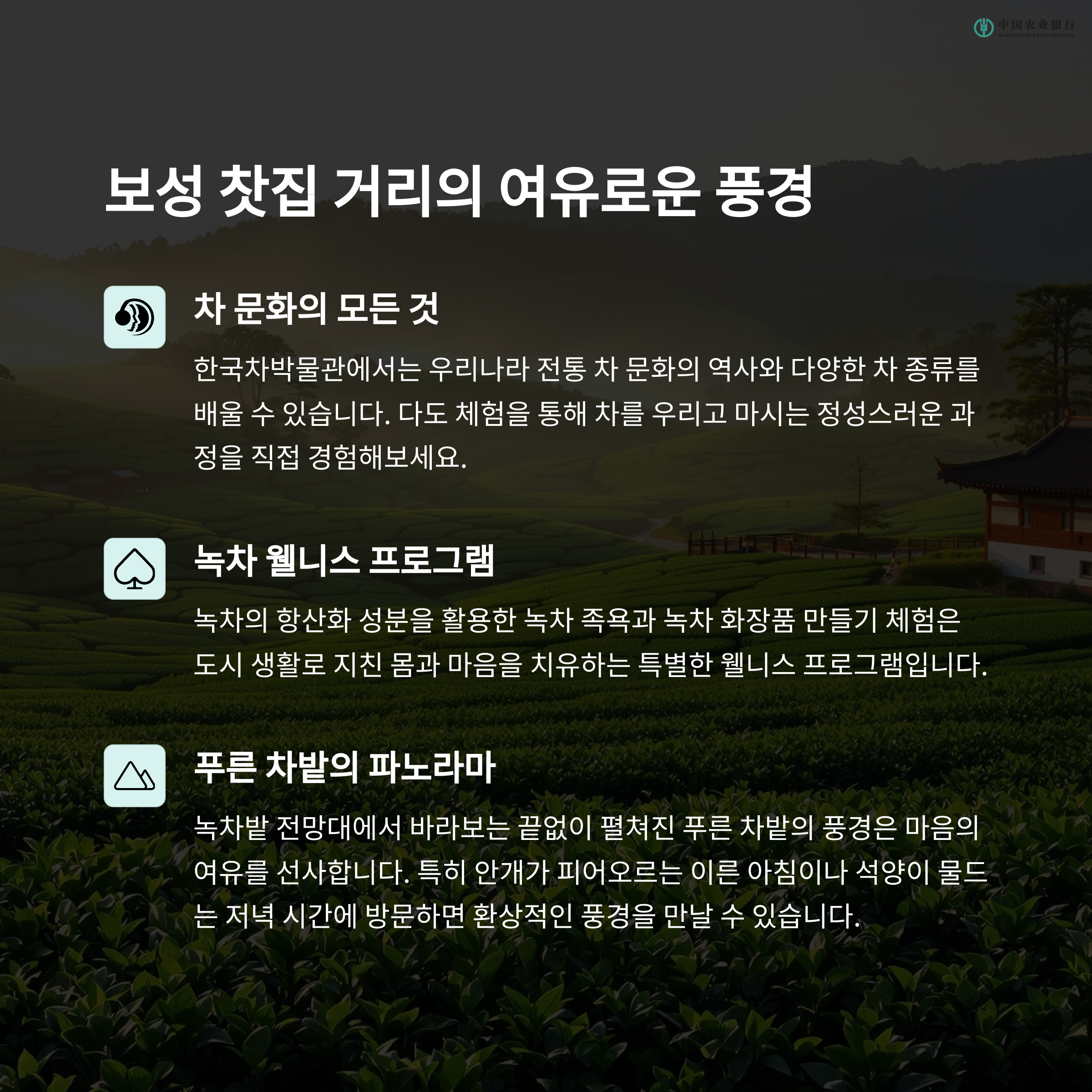 - 찻잎 따기 체험 + 전통 다도 클래스도 가능
