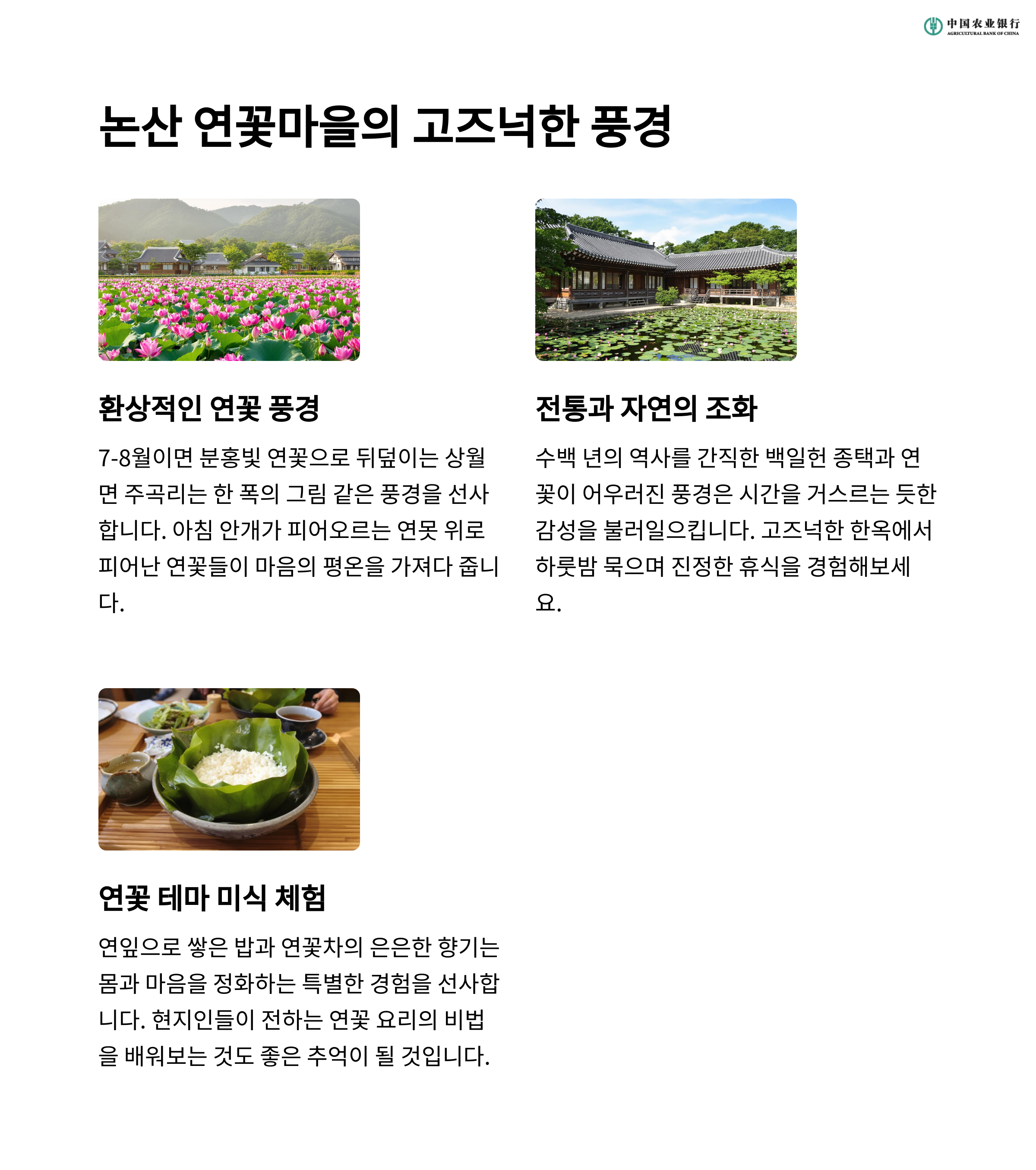 - 연잎차 & 연근 정식 같은 지역 향토음식도 체험 가능