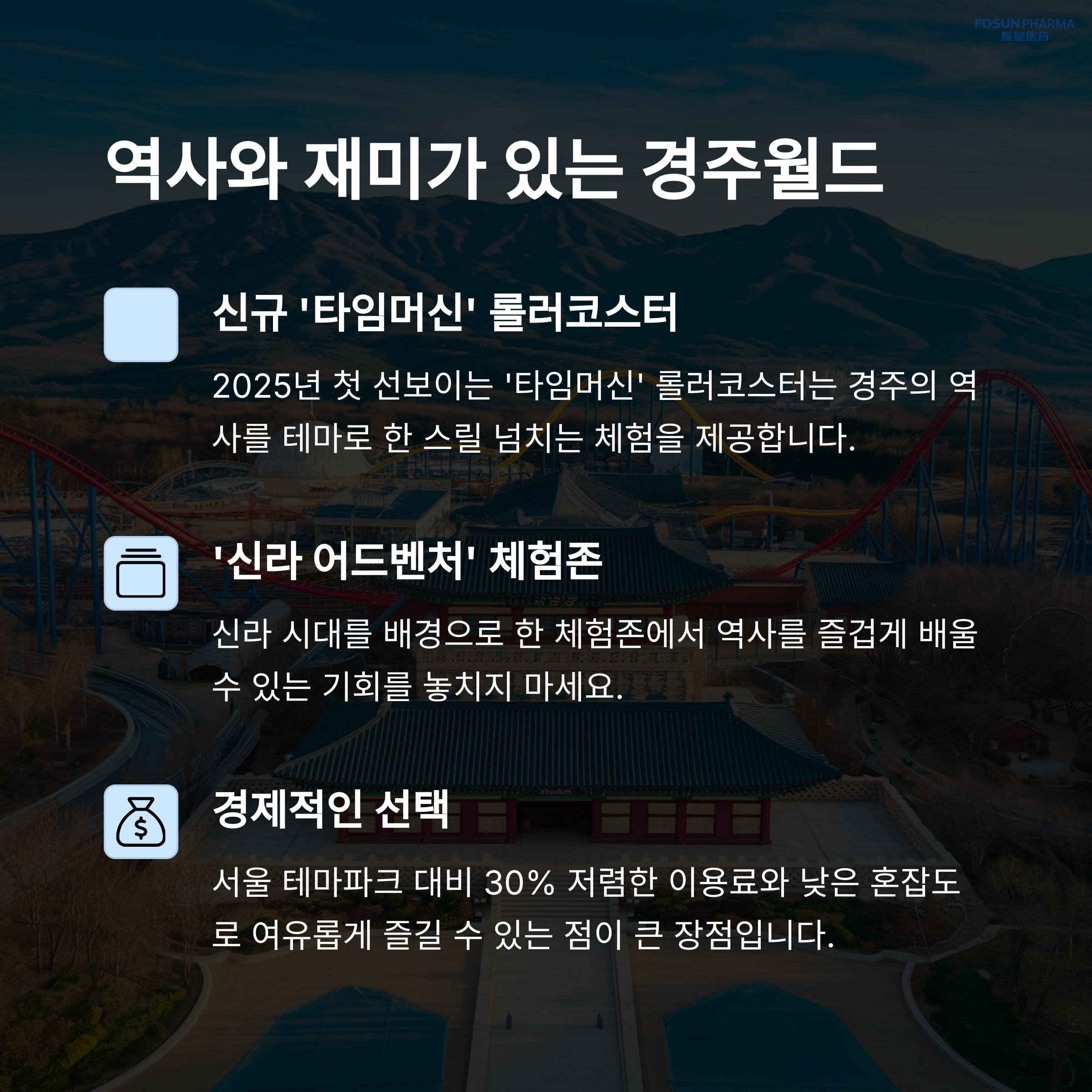 경주월드는 다양한 어린이 전용 어트랙션과 스릴 넘치는 놀이기구가 절묘하게 조화를 이루는 곳입니다.