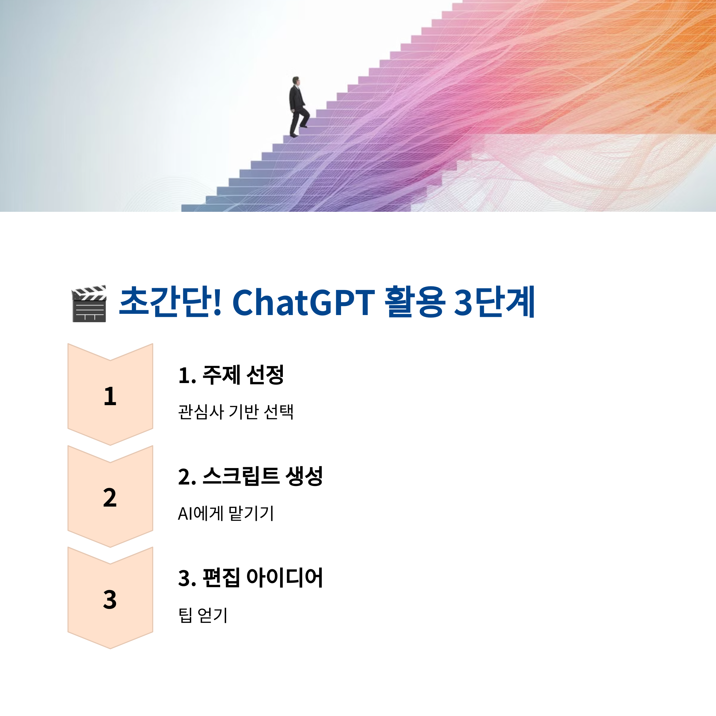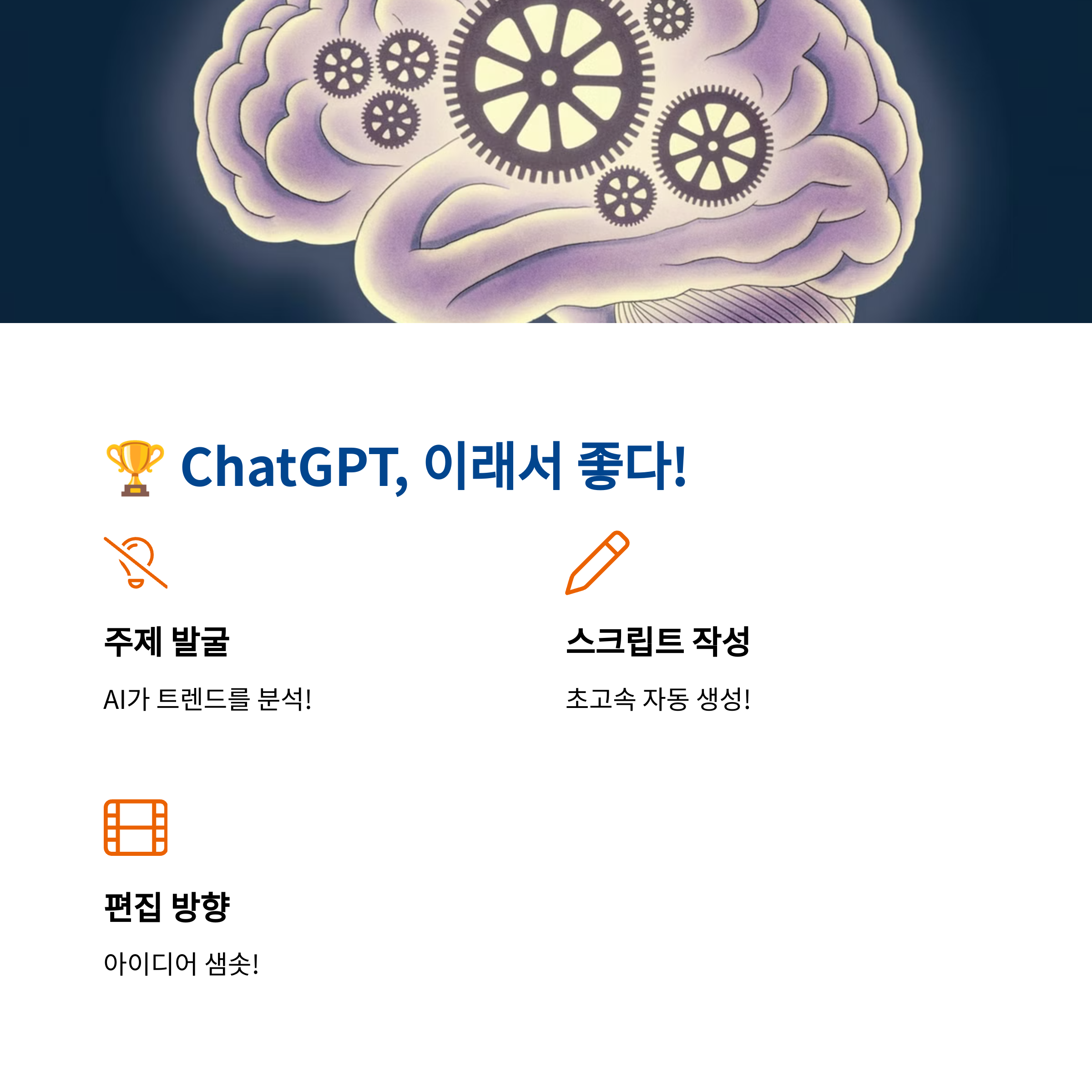 ✔ 주제 고민 ❌ (ChatGPT가 다 찾아줌) ✔ 영상 스크립트 ❌ (AI가 자동으로 써줌) ✔ 편집 방향 ❌ (AI가 아이디어까지 줌!)
