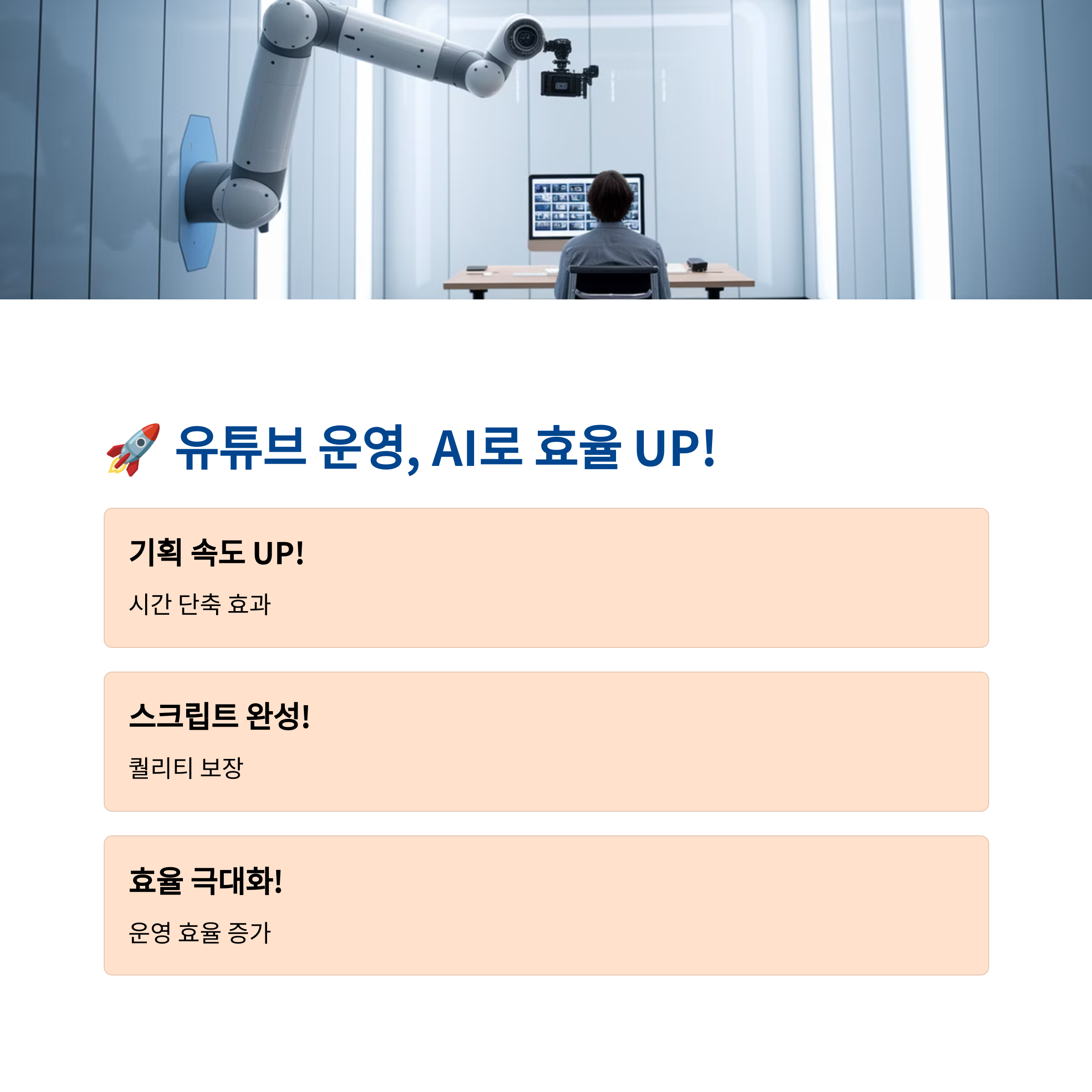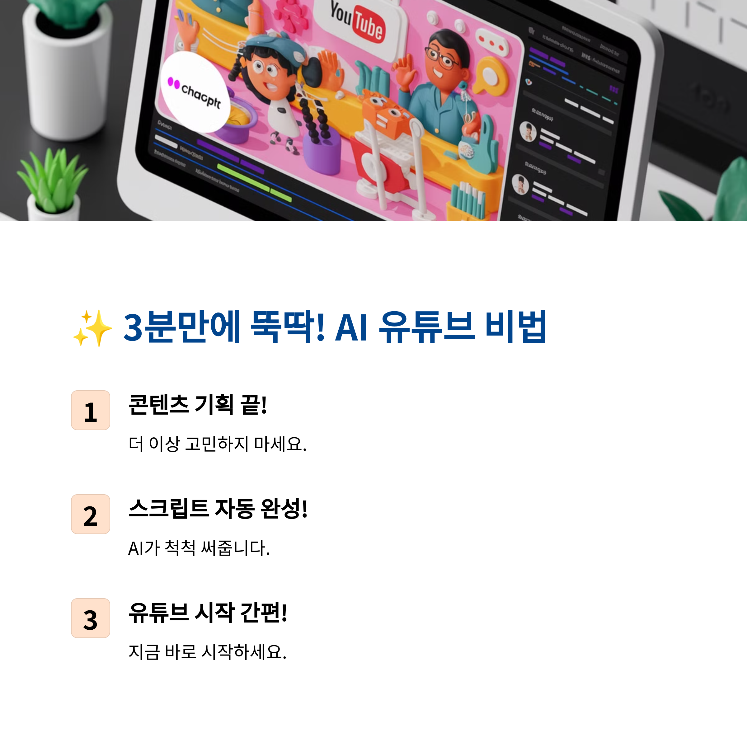 🎯 AI 유튜브, 지금 시작해야 돈 번다! ✔ ChatGPT 활용하면 기획~편집까지 자동화 가능 ✔ 영상 제작 속도 2배 상승! 🚀 ✔ 유튜브 수익화까지 한 방에 해결!