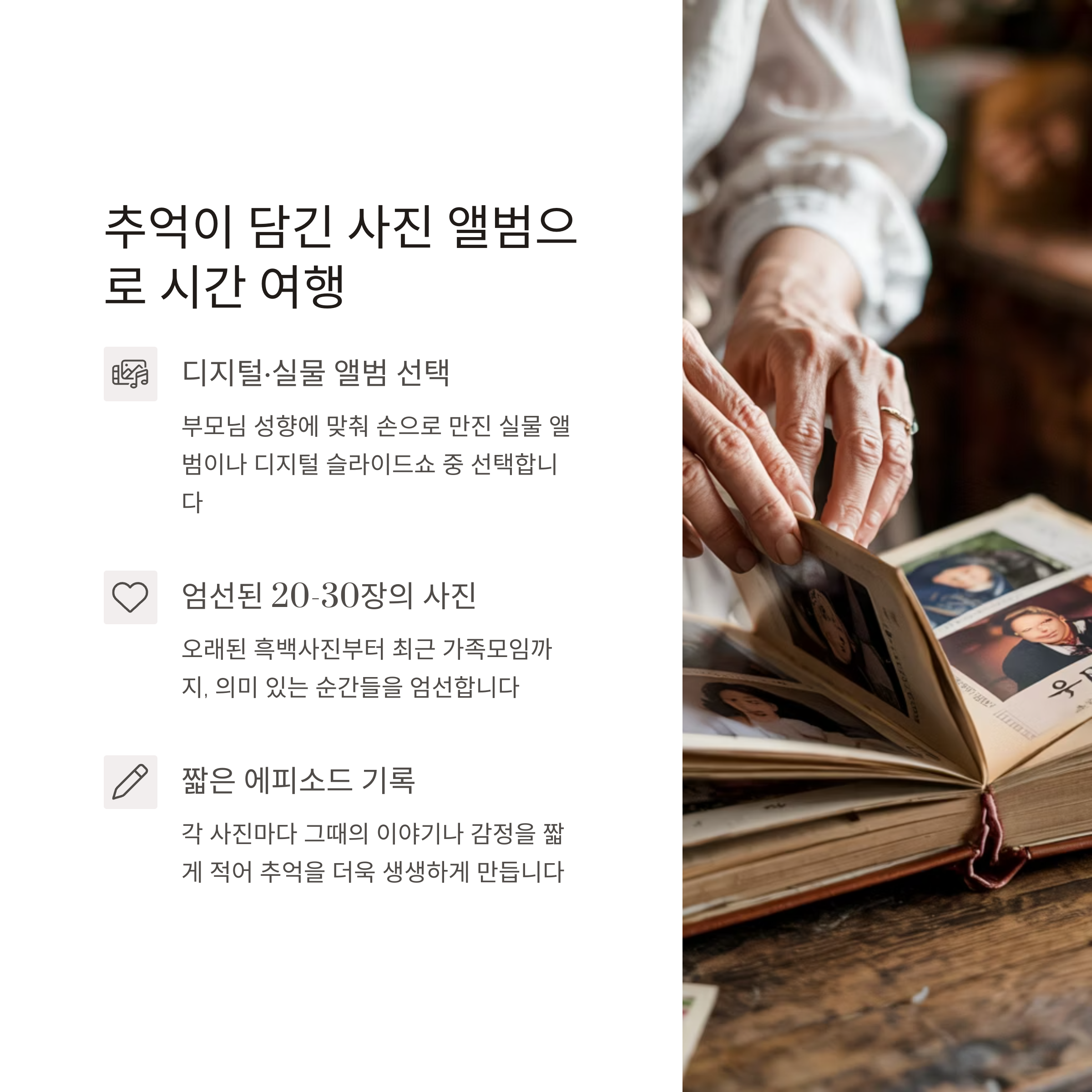 오래된 사진을 꺼내 부모님과 함께 이야기 나누며 앨범을 정리해보세요. 젊은 시절의 모습, 아이들의 성장기, 함께한 여행들… 그 속에 숨어 있던 이야기들이 다시 피어납니다.