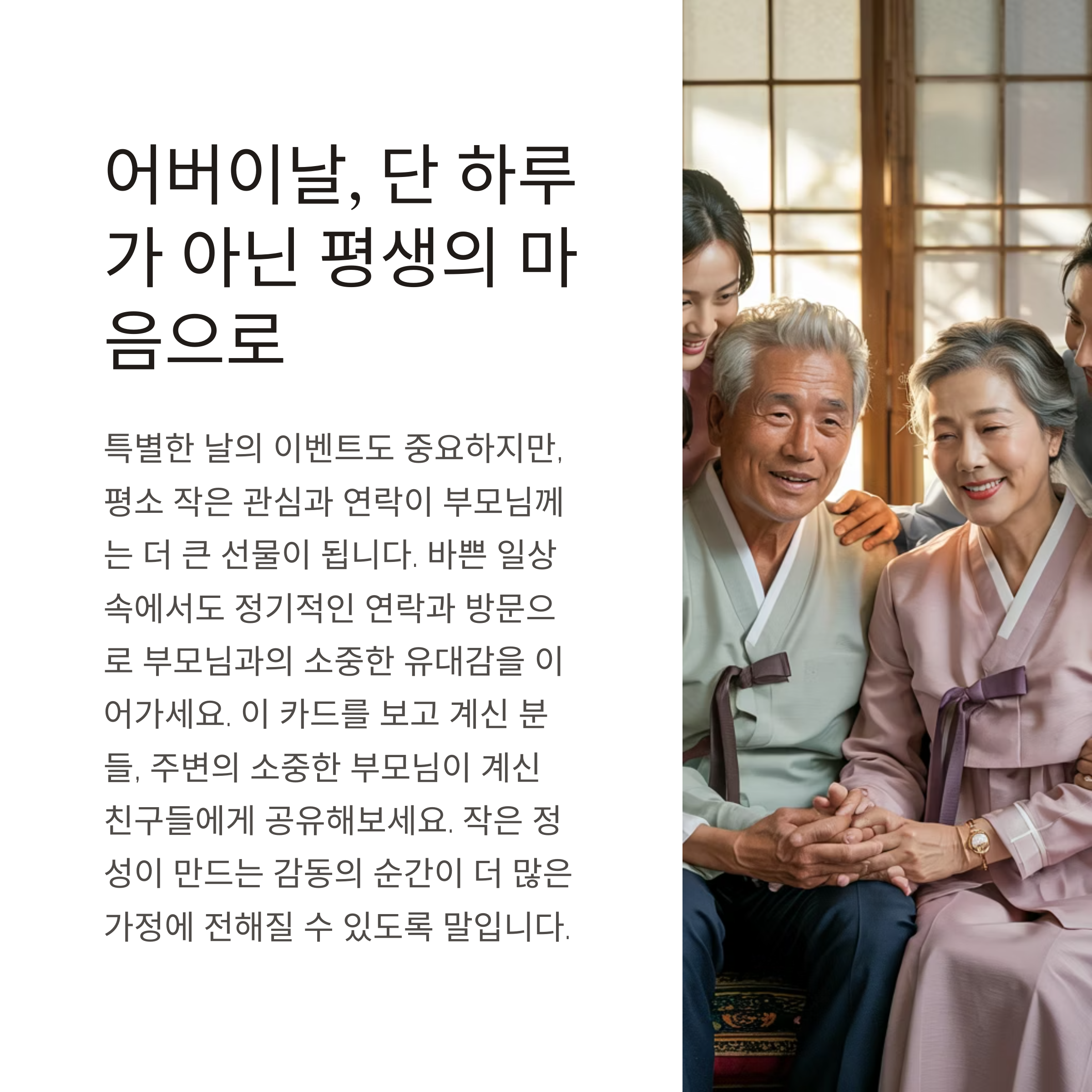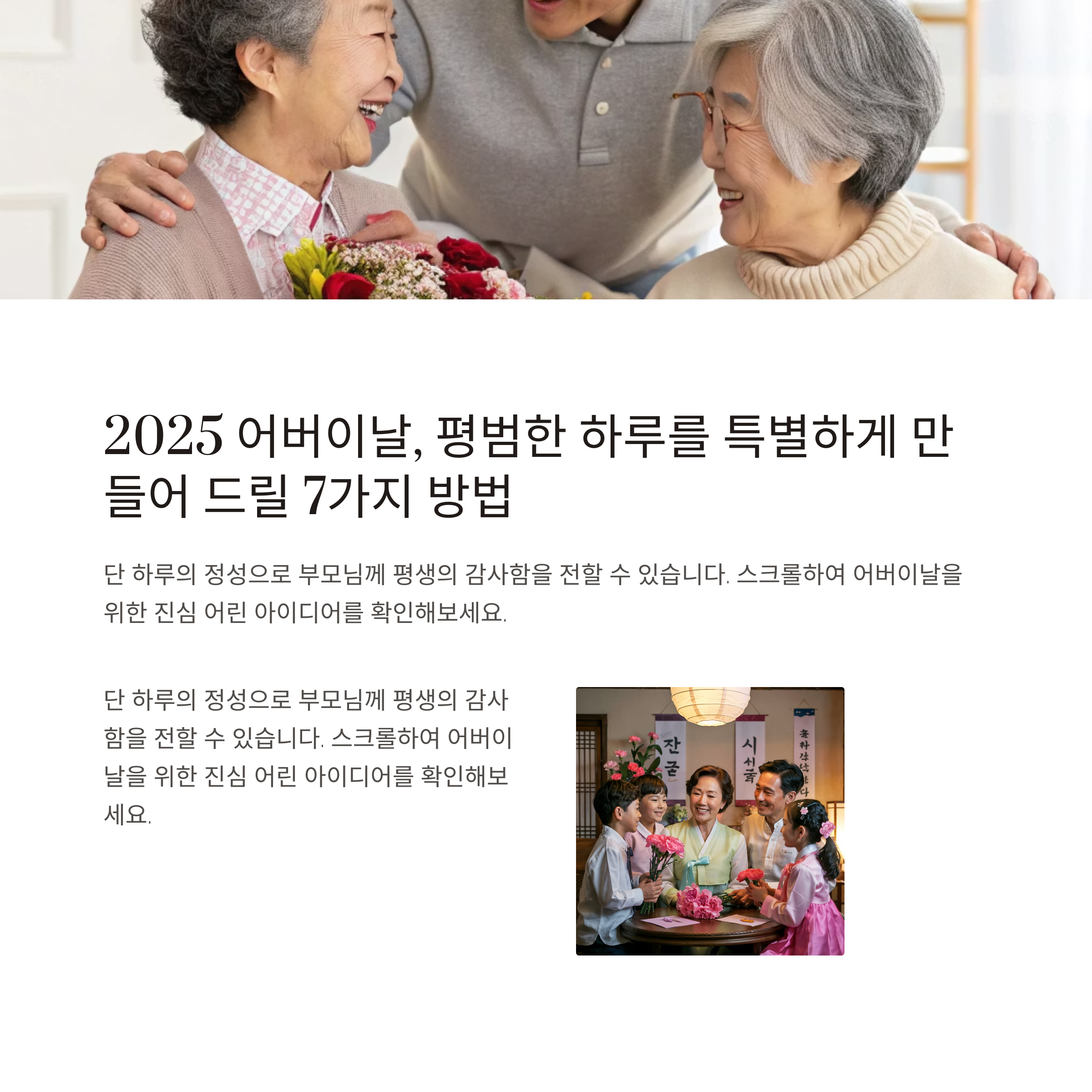 2025년 어버이날, 무엇보다 중요한 건 마음의 전달입니다. 단 하루라도 부모님께 오롯이 집중해드릴 수 있다면, 그것만으로도 이미 최고의 선물이 될 거예요.