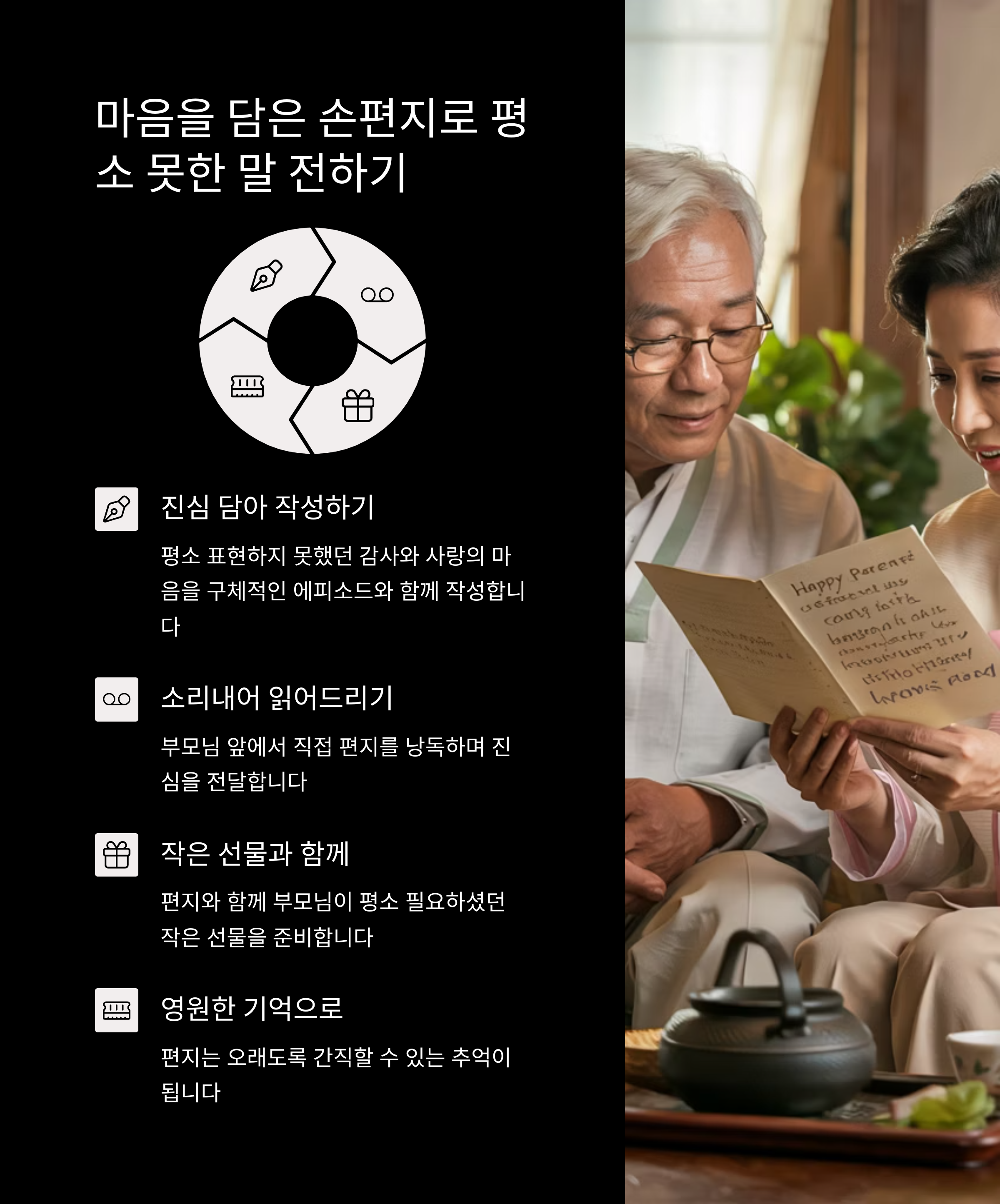 당신이 직접 쓴 한 장의 편지는 그 어떤 선물보다 진한 감동을 줍니다. 긴 글이 아니어도 괜찮아요. 그저 고마운 마음, 기억하고 있는 순간, 그리고 앞으로 함께 하고 싶은 이야기를 담아보세요.