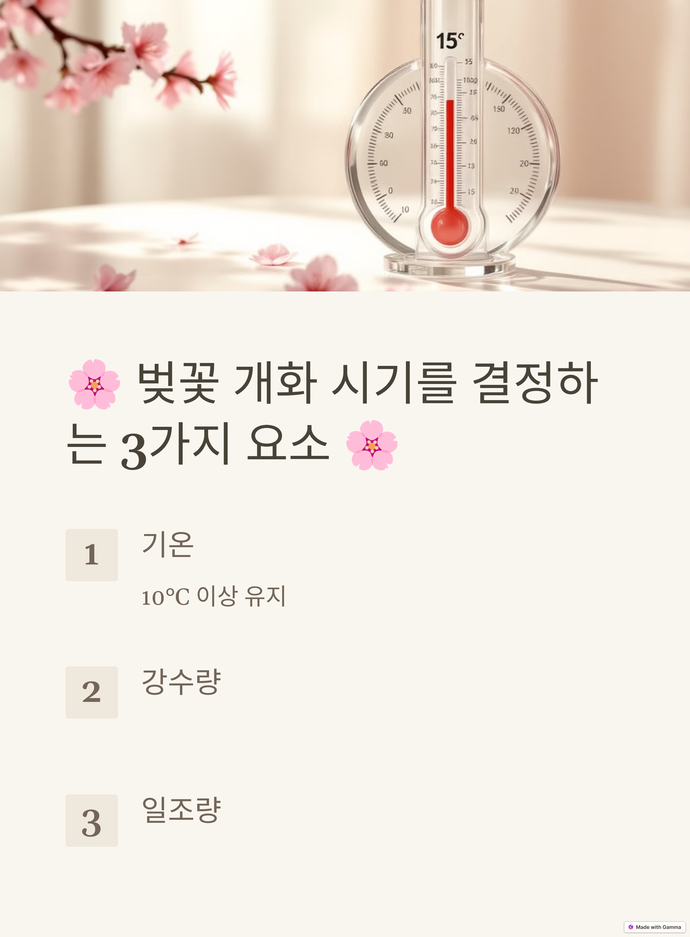 | 벚꽃 개화 요소 | 벚꽃 개화는 기온, 강수량, 일조량 등의 영향을 받습니다. |