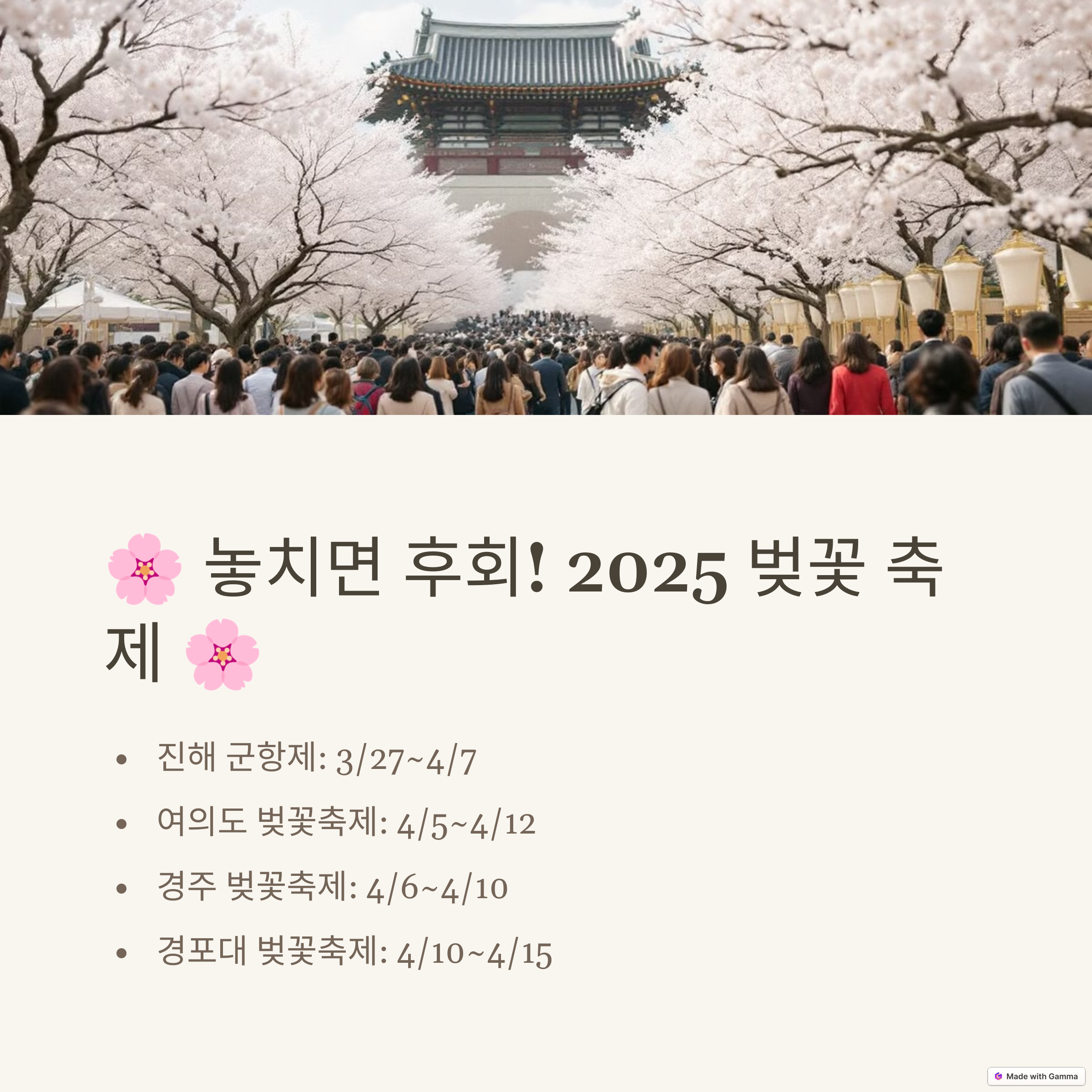태그:#벚꽃개화, #2025벚꽃, #벚꽃명소, #봄여행, #벚꽃축제, #여행추천