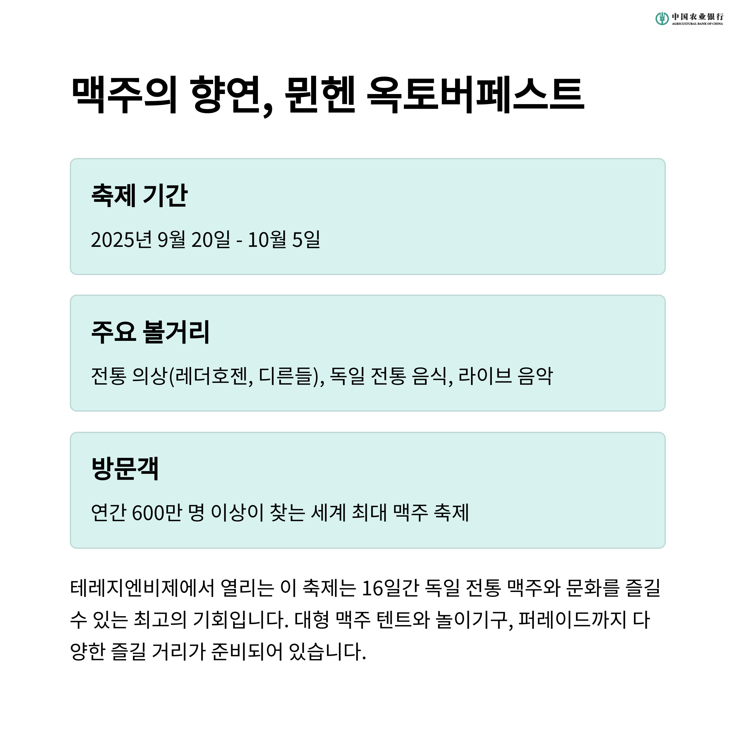 옥토버페스트는 단순한 맥주 축제가 아니라, 독일 문화를 체험하고, 친구들과 함께 즐거운 시간을 보낼 수 있는 국제적인 행사입니다. 디지털 맥주잔과 디지털 게임 등 새로운 매력도 가득한 축제입니다.