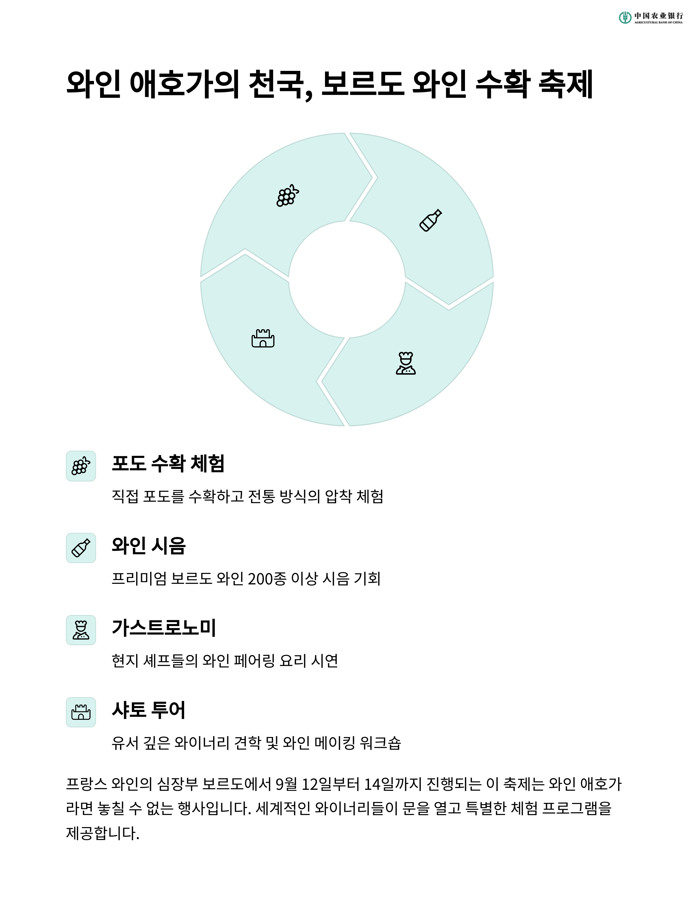 보르도 와인 수확 축제는 프랑스 보르도에서 열리는 세계적인 와인 축제입니다. 매년 9월, 보르도 지역의 포도밭에서는 와인 수확을 기념하는 축제가 열리며, 전 세계의 와인 애호가들이 모여 프랑스의 전통적인 와인을 맛보고, 와인 만들기 과정을 체험할 수 있습니다. 이 축제는 와인과 프랑스의 전통 문화를 함께 즐길 수 있는 특별한 기회를 제공합니다.
