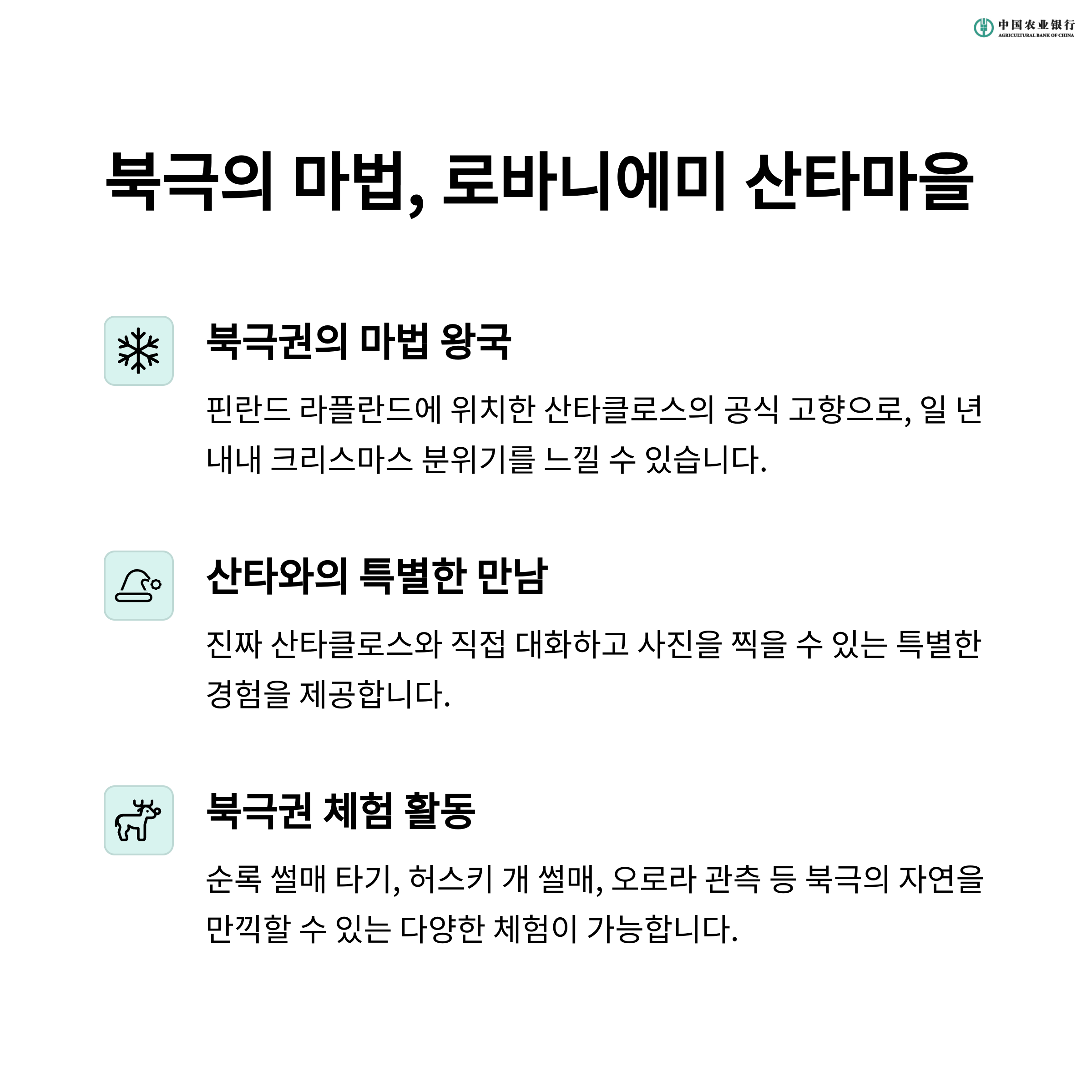 산타클로스 마을은 오로라와 함께하는 겨울 축제로 유명하며, 마을 곳곳에서 펼쳐지는 겨울 축제는 가족 단위 여행객들에게 최고의 장소입니다. 겨울밤의 눈꽃 마을은 마치 동화 속 한 장면처럼 아름답습니다.