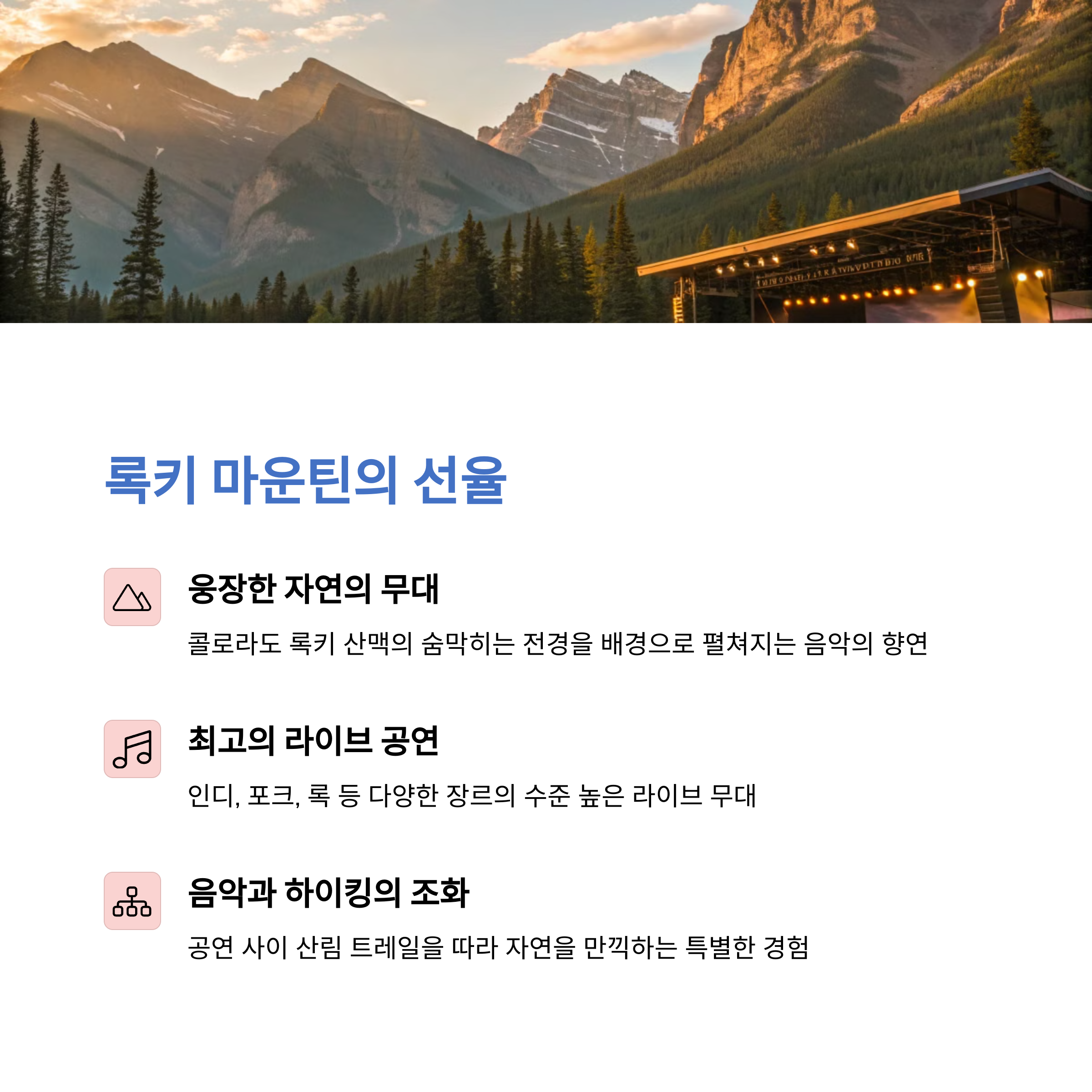 록키 마운틴 음악 축제는 미국 록키 산맥에서 열리는 야외 음악 축제입니다. 이 축제는 자연 속에서 즐길 수 있는 다양한 음악 공연을 제공하며, 방문객들은 록키 산맥의 아름다운 풍경과 함께 음악을 즐길 수 있습니다. 음악과 자연을 동시에 경험할 수 있는 이 축제는 산악 지형과 탁 트인 풍경을 배경으로 펼쳐지는 공연이 특징입니다. 다양한 장르의 음악을 즐기며 자연 속에서 힐링하는 최고의 기회입니다. 여름철, 록키 산맥에서 다양한 음악과 함께하는 모험을 경험해 보세요!