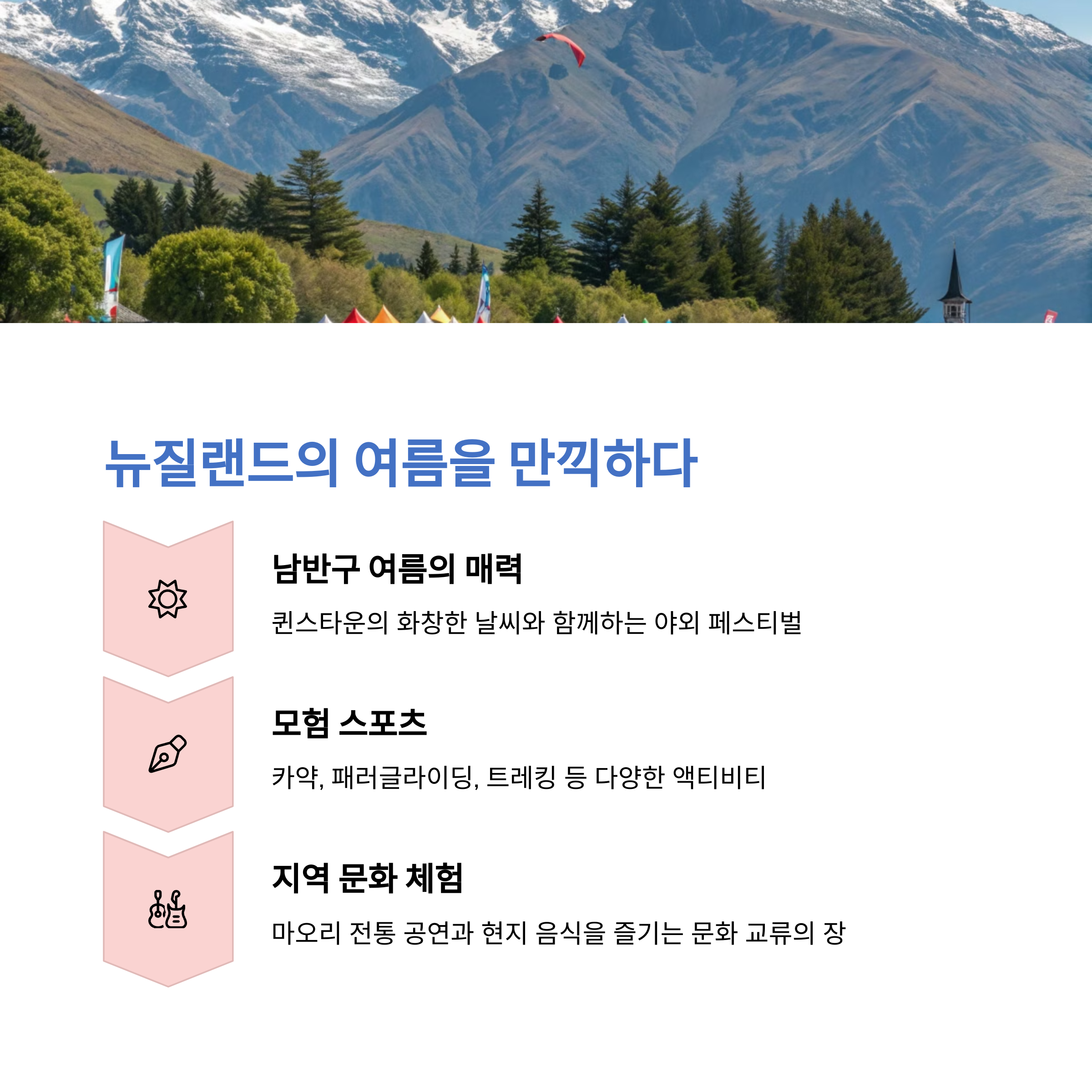 뉴질랜드 여름 아웃도어 페스티벌은 자연 속 아웃도어 활동과 음악 축제가 결합된 축제입니다. 뉴질랜드의 아름다운 자연에서 펼쳐지는 다양한 활동과 음악 공연은 모든 참가자들에게 모험적이고도 문화적인 경험을 선사합니다. 축제는 산악 트레킹, 캠핑, 카약과 같은 야외 활동을 포함하고 있으며, 저녁에는 라이브 음악 공연이 열립니다. 자연을 만끽하면서 다양한 활동을 즐길 수 있는 이 축제는 모험과 음악을 모두 사랑하는 사람들에게 완벽한 경험을 제공합니다.