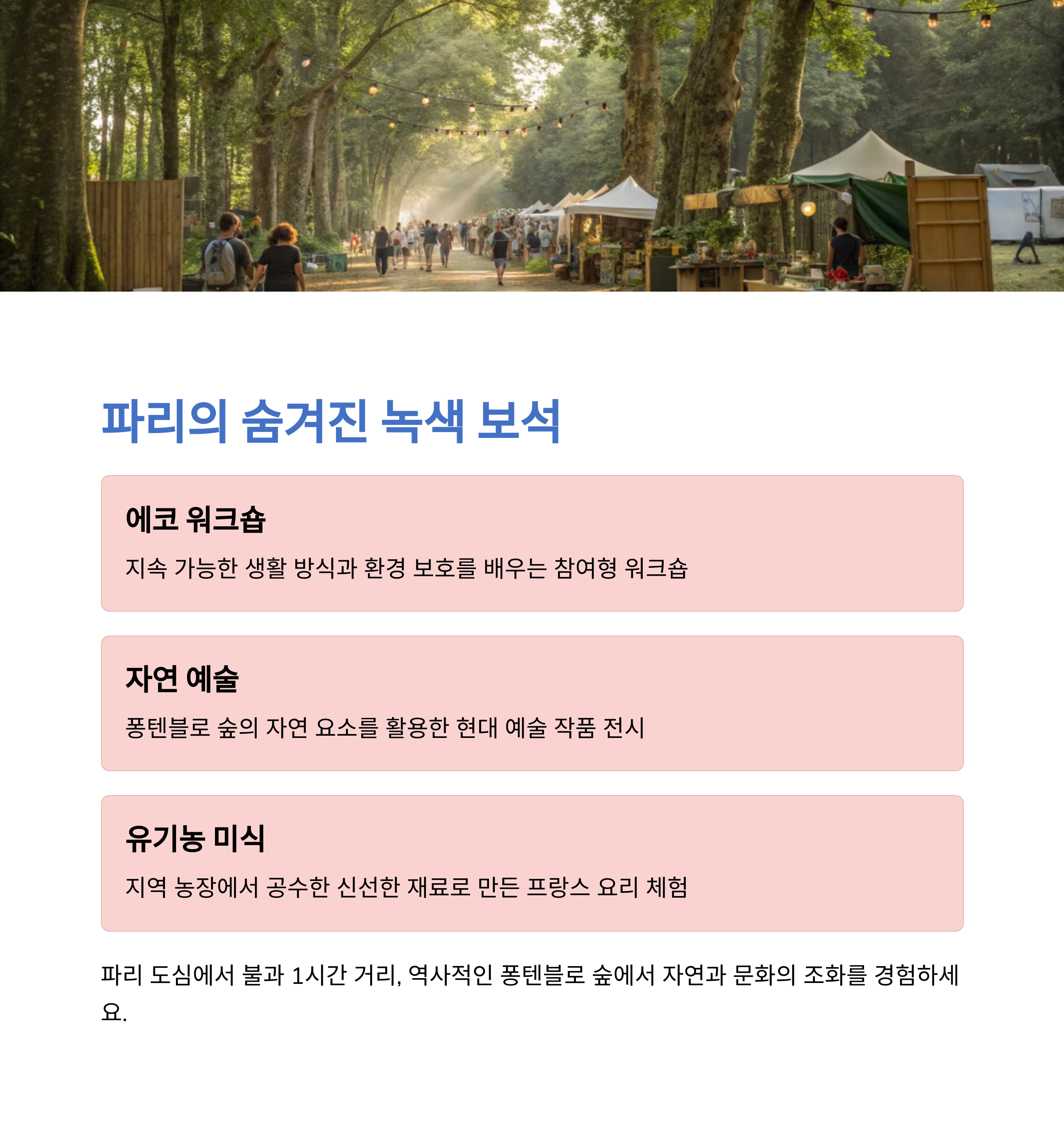 파리 외곽 자연 축제는 프랑스 파리 외곽에서 열리는 자연과 음악이 결합된 축제입니다. 이 축제는 야외 무대에서 펼쳐지는 문화 공연과 다양한 자연 활동을 즐길 수 있는 기회를 제공합니다. 특히, 파리 외곽의 자연을 배경으로 한 이 축제는 방문객들에게 자연의 아름다움과 함께 프랑스의 전통 음악을 체험할 수 있는 기회를 제공합니다. 음악뿐만 아니라 환경 보호 활동도 포함되어 있어, 자연을 보호하는 가치를 배울 수 있습니다. 여름의 파리 외곽에서 자연과 문화가 어우러지는 축제를 경험해 보세요!