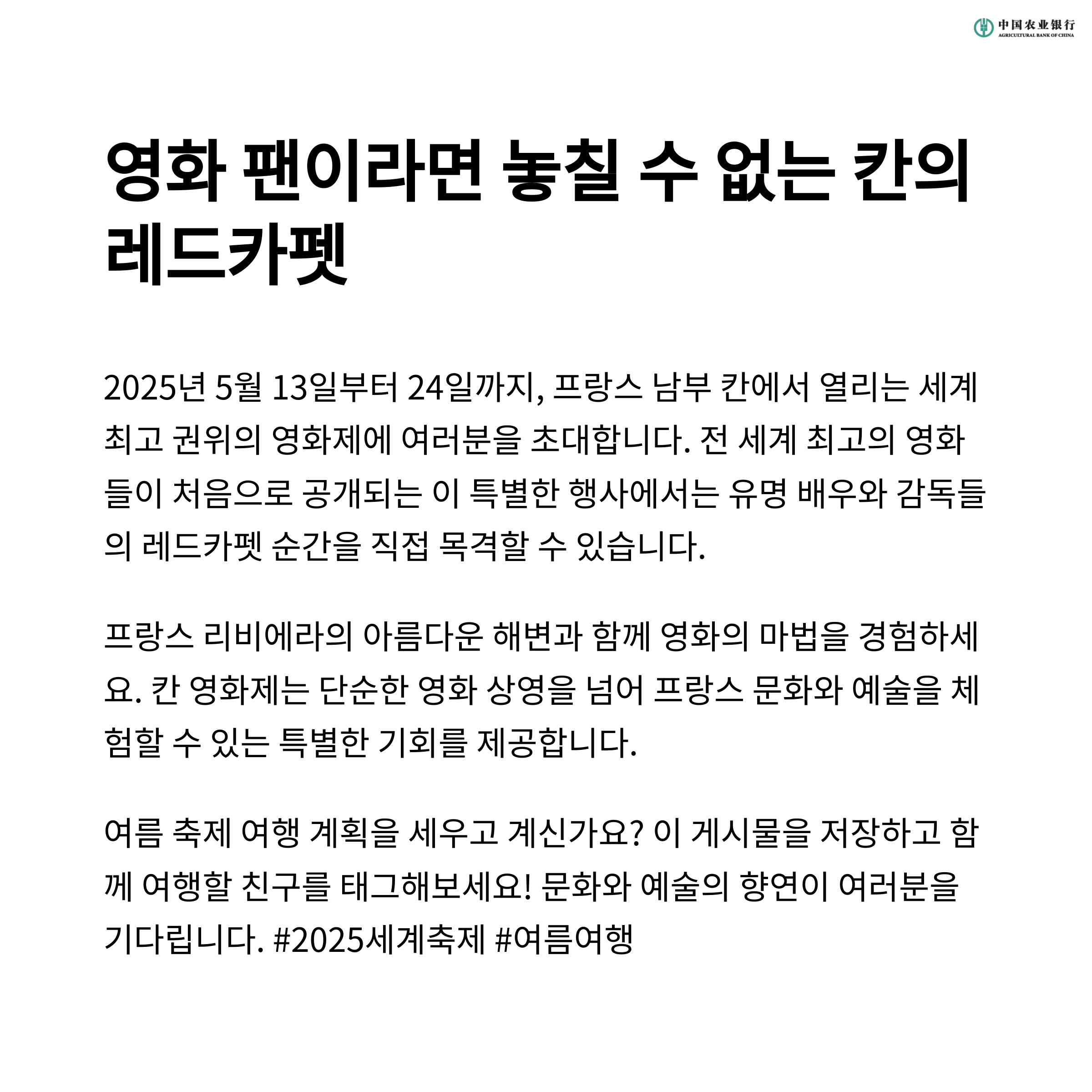 칸 영화제에서는 새로운 영화 트렌드와 최고의 작품들을 미리 관람할 수 있으며, 영화계의 스타들을 만날 수 있는 특별한 기회를 제공합니다. 칸 영화제는 문화와 예술을 사랑하는 사람들에게 최고의 축제입니다.