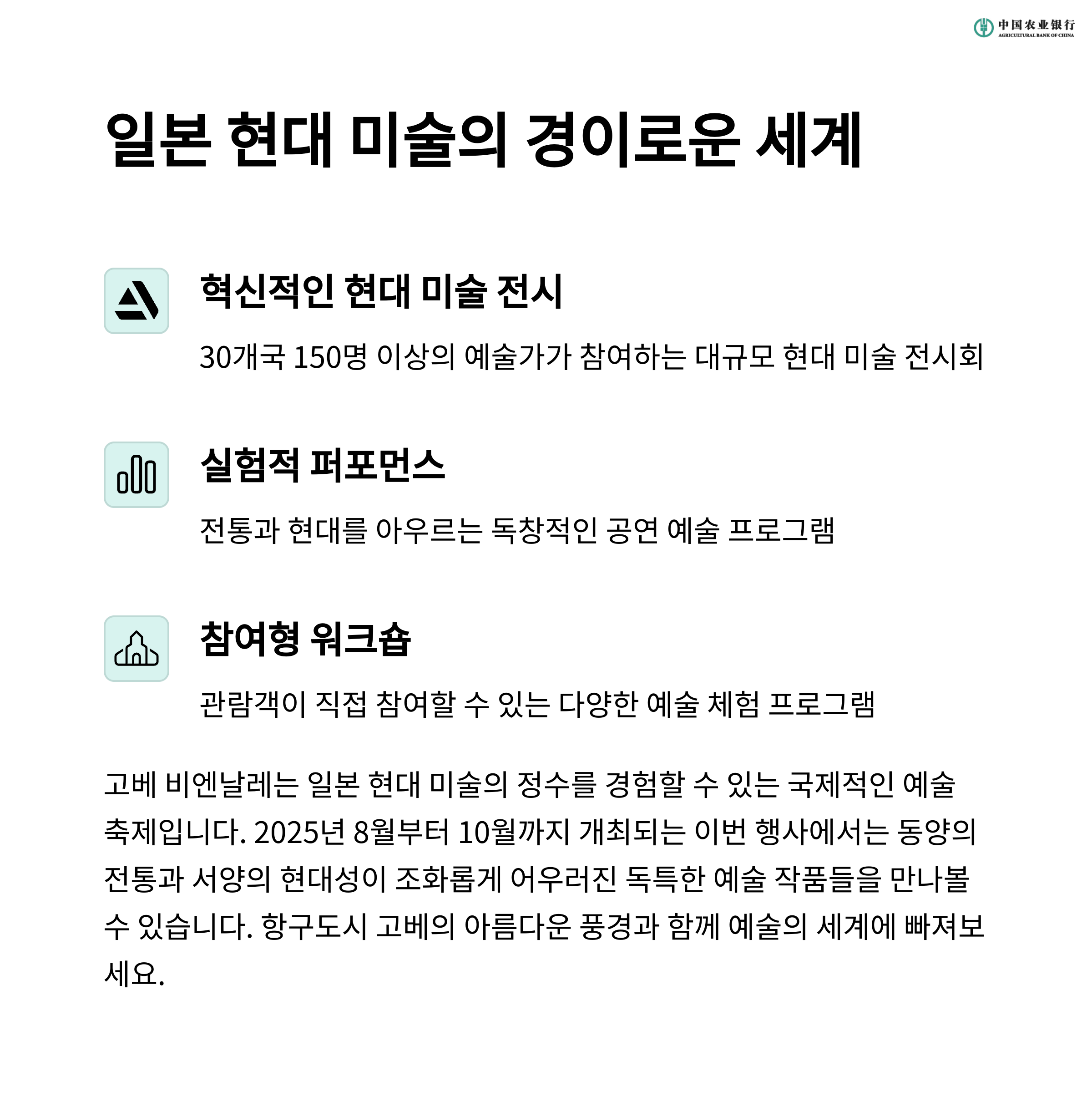 특히, 고베의 아름다운 항구와 시내 곳곳에 설치된 예술 작품들은 미술 애호가들에게 큰 매력을 선사합니다. 국제 미술 전시와 함께 다양한 문화 행사도 열리며, 일본의 미술과 문화를 한눈에 볼 수 있는 기회입니다.