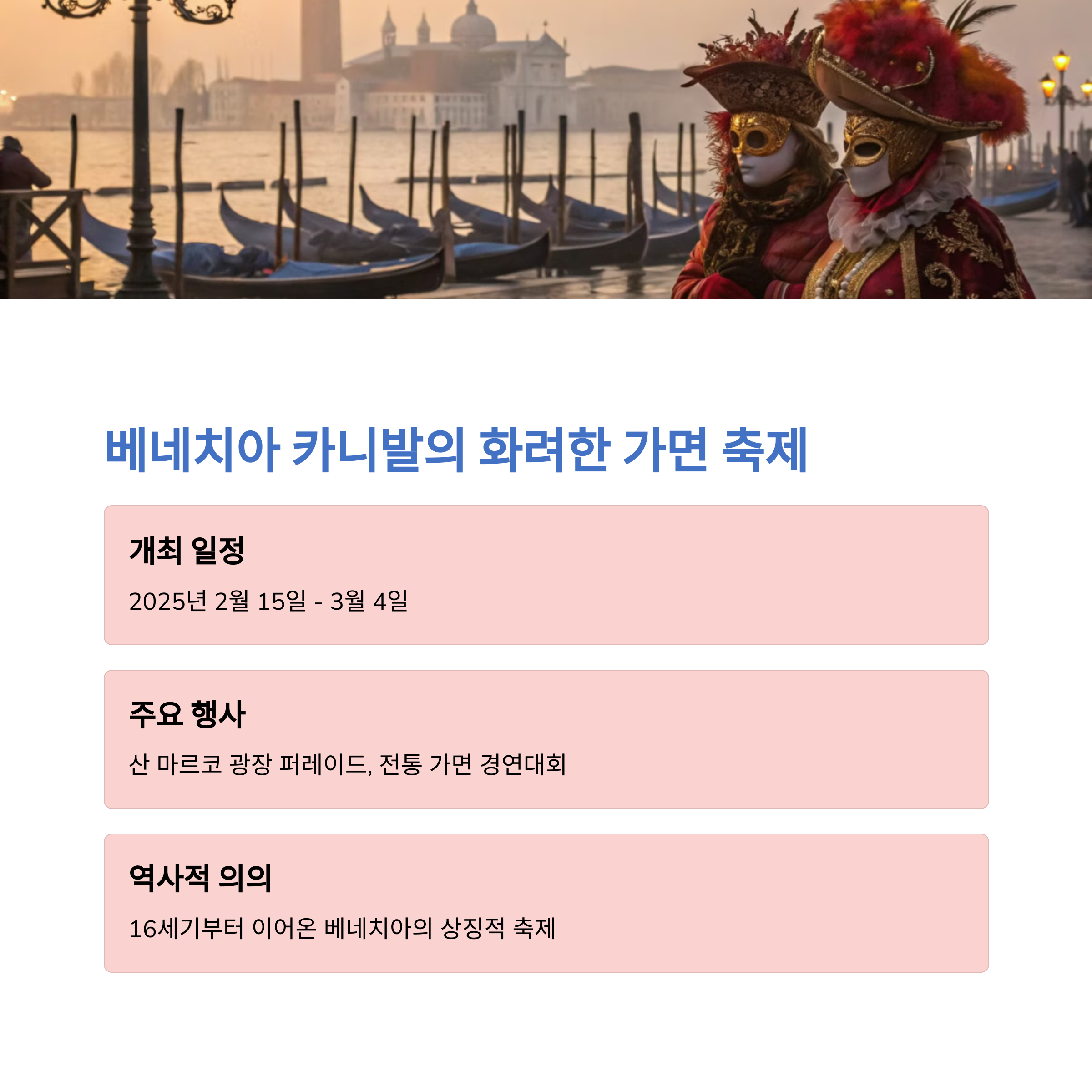 베네치아 카니발은 이탈리아 베네치아에서 열리는 역사적인 카니발 축제로, 화려한 가면과 함께 베네치아의 전통을 경험할 수 있는 기회를 제공합니다. 중세의 베네치아 분위기를 만끽할 수 있는 역사적인 축제입니다.