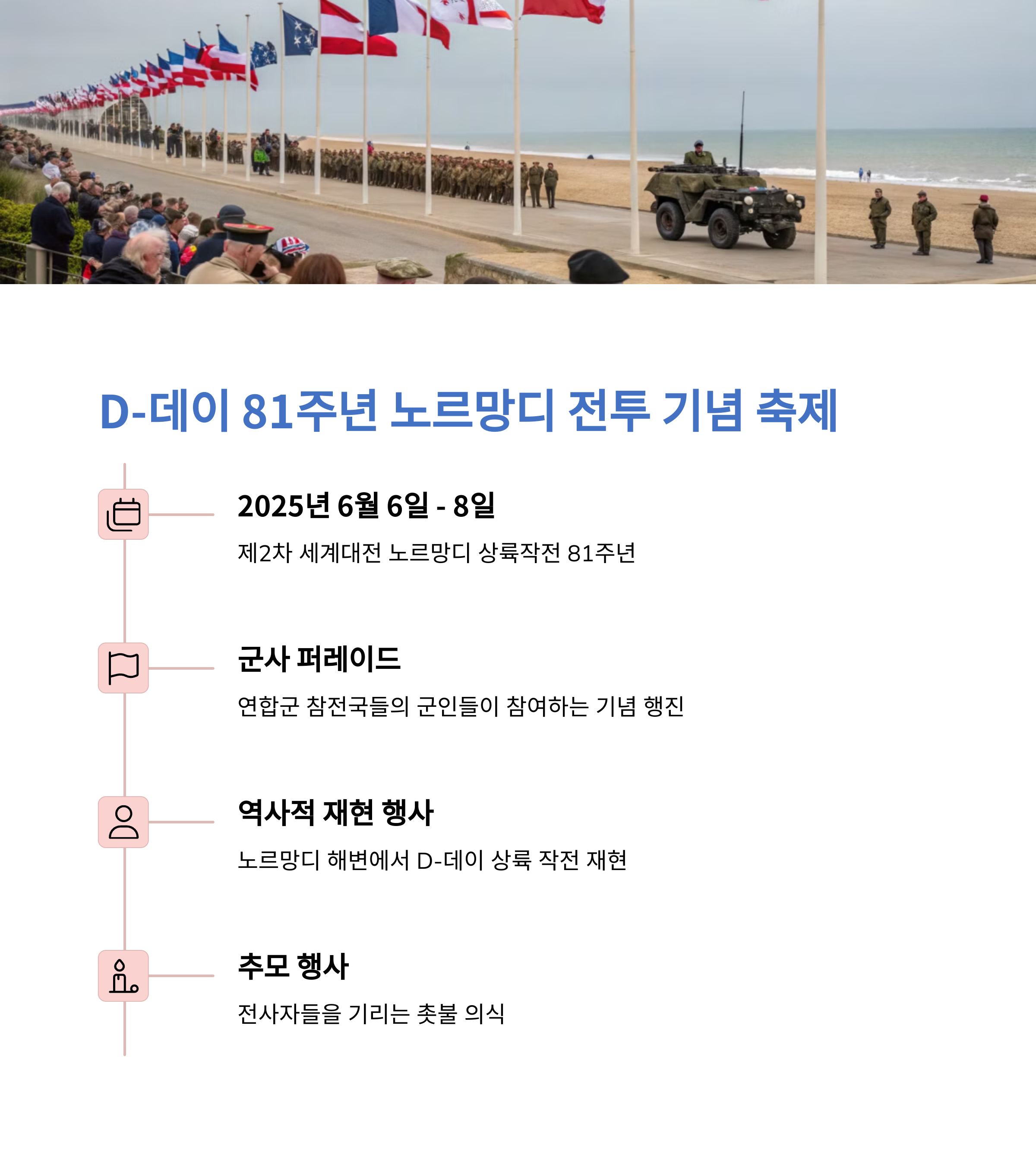 노르망디 전투 기념 축제는 프랑스 노르망디에서 D-Day를 기념하는 역사적인 축제입니다. 제2차 세계대전의 역사적인 순간을 되새기며 군사 재현과 역사적인 공연을 즐길 수 있습니다.