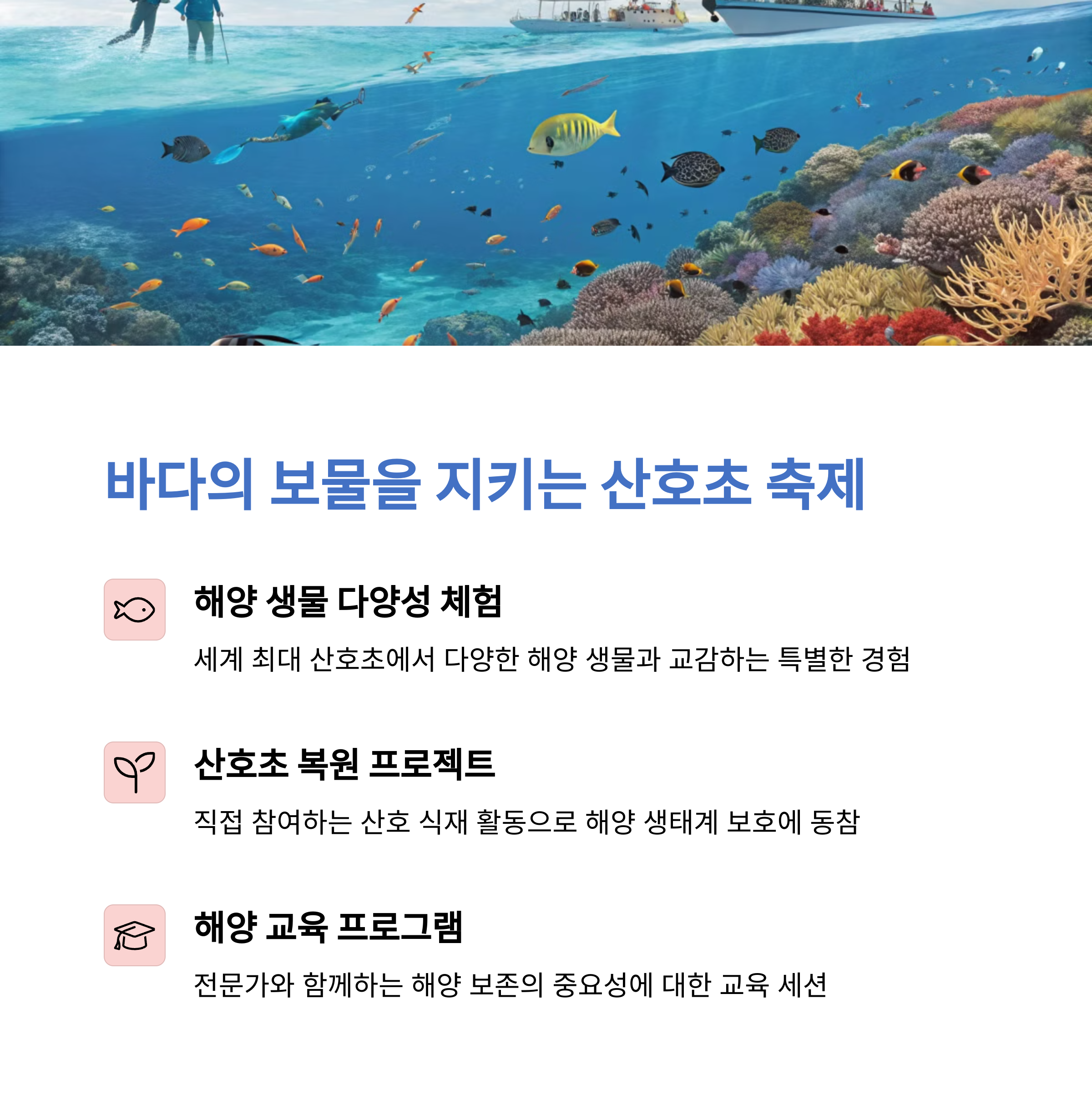 그레이트 배리어 리프 축제는 호주의 그레이트 배리어 리프에서 열리는 자연 보호와 환경 교육을 주제로 한 축제입니다. 바다 보호와 자연 보전을 알리는 이 축제는 수중 스포츠와 자연 체험을 결합하여 방문객들에게 풍성한 경험을 제공합니다.