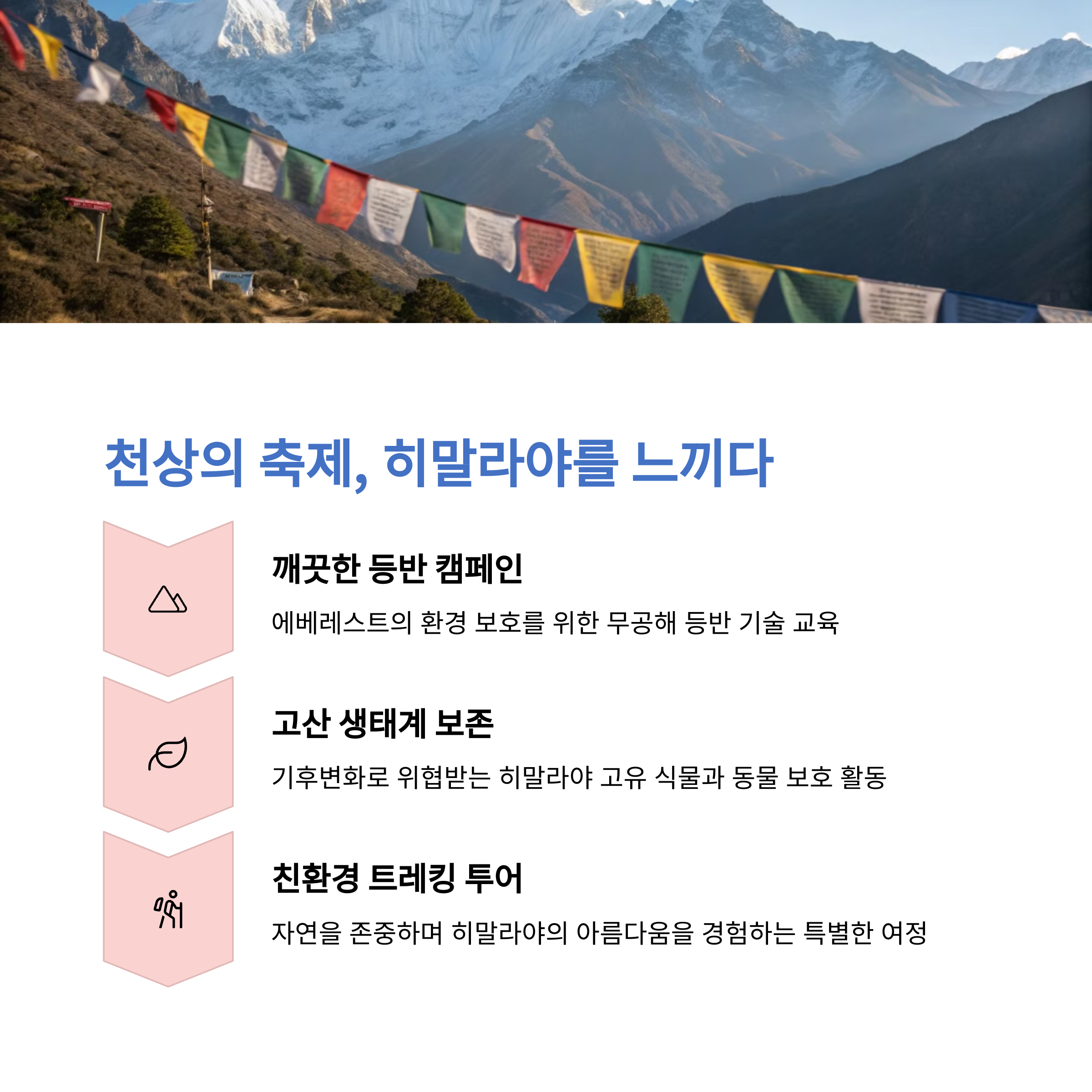 히말라야 환경 축제는 네팔 히말라야에서 열리는 자연 보호와 지속 가능한 환경을 기념하는 축제입니다. 히말라야 산맥을 배경으로 펼쳐지는 이 축제는 지구의 자연 보호와 환경 보전을 위한 다양한 프로그램을 제공합니다.