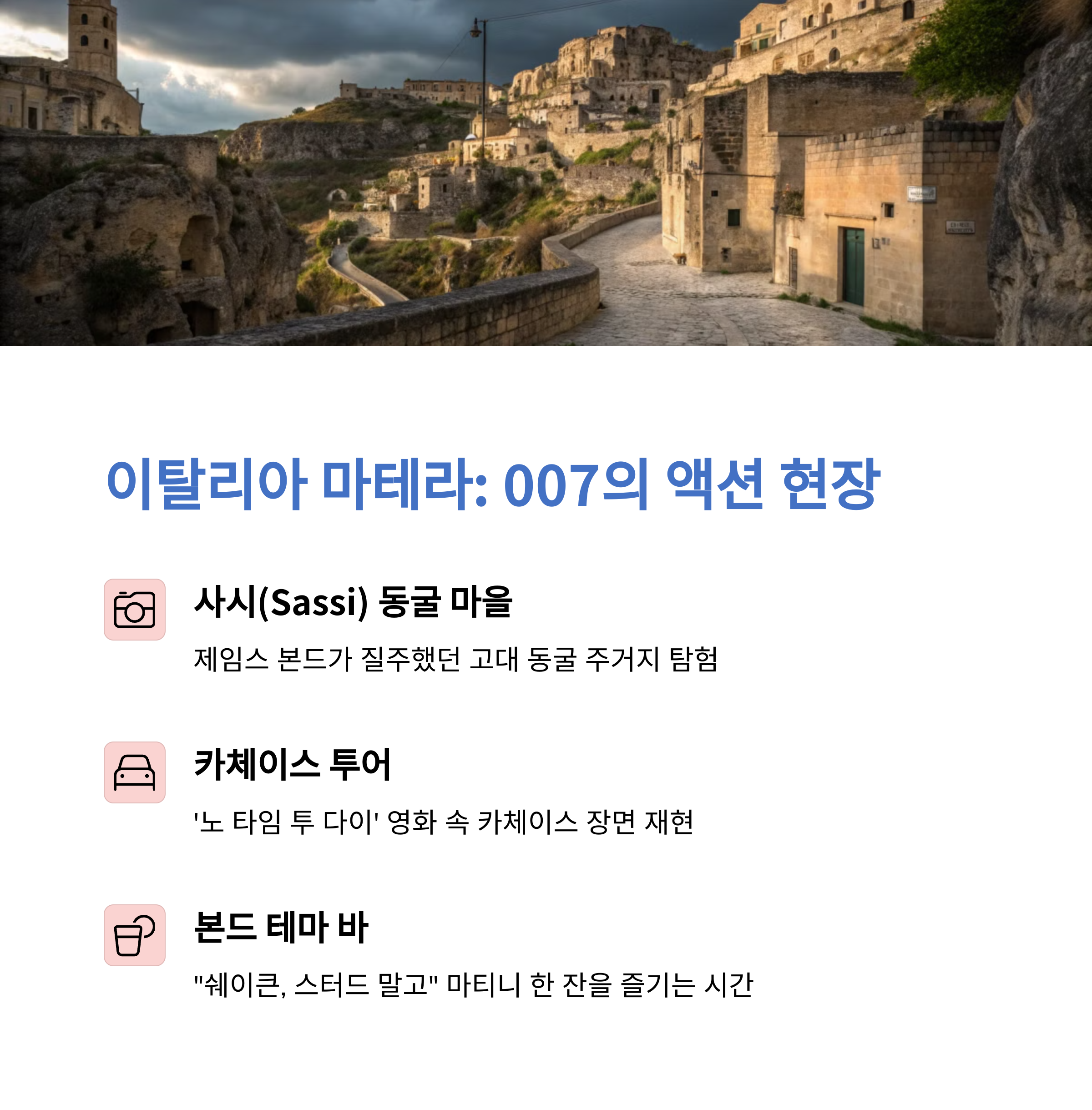 <007 노 타임 투 다이> 오프닝 추격신의 무대인 마테라는 수세기 동안 동굴 주거지로 유명한 도시입니다.